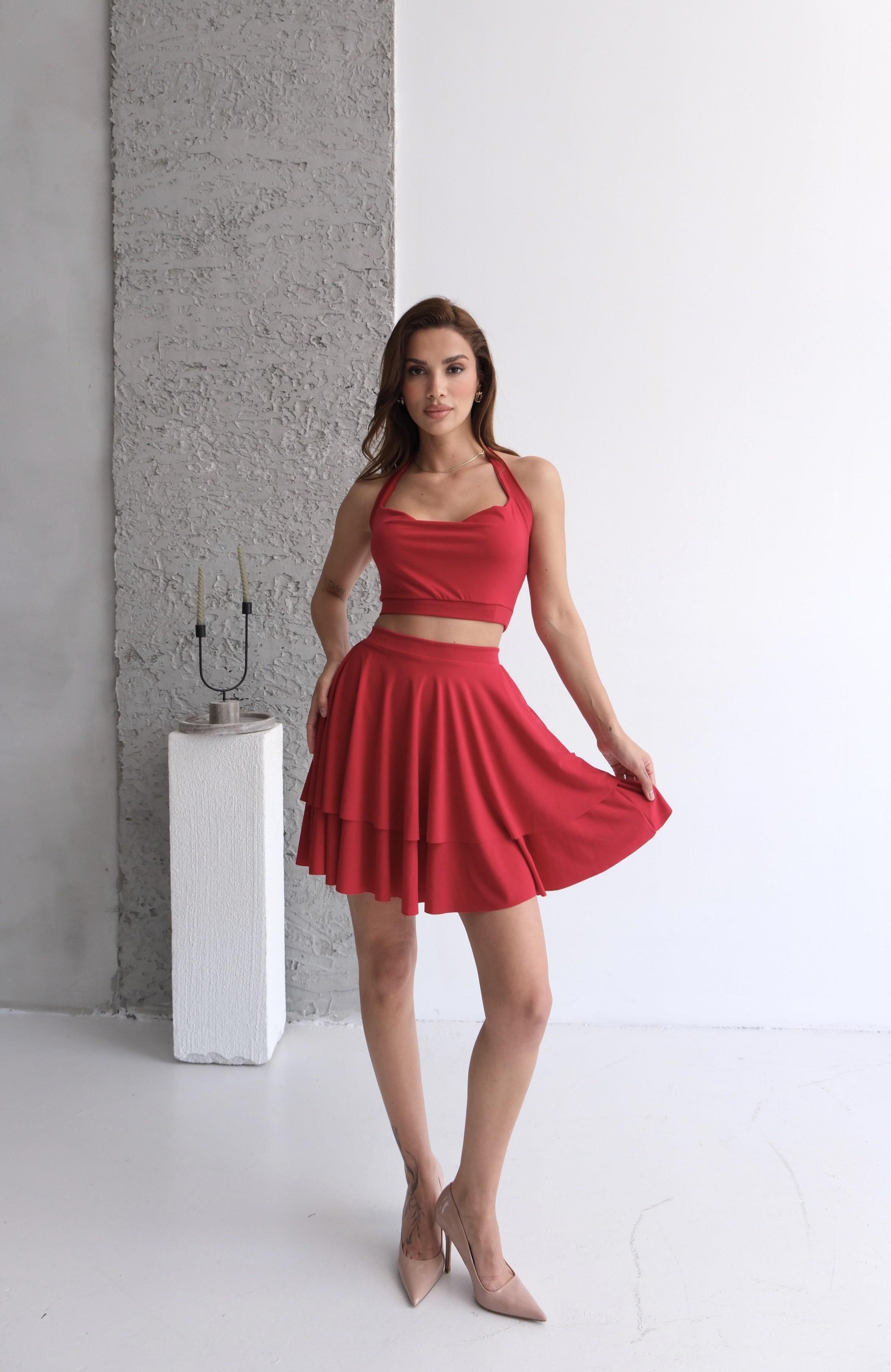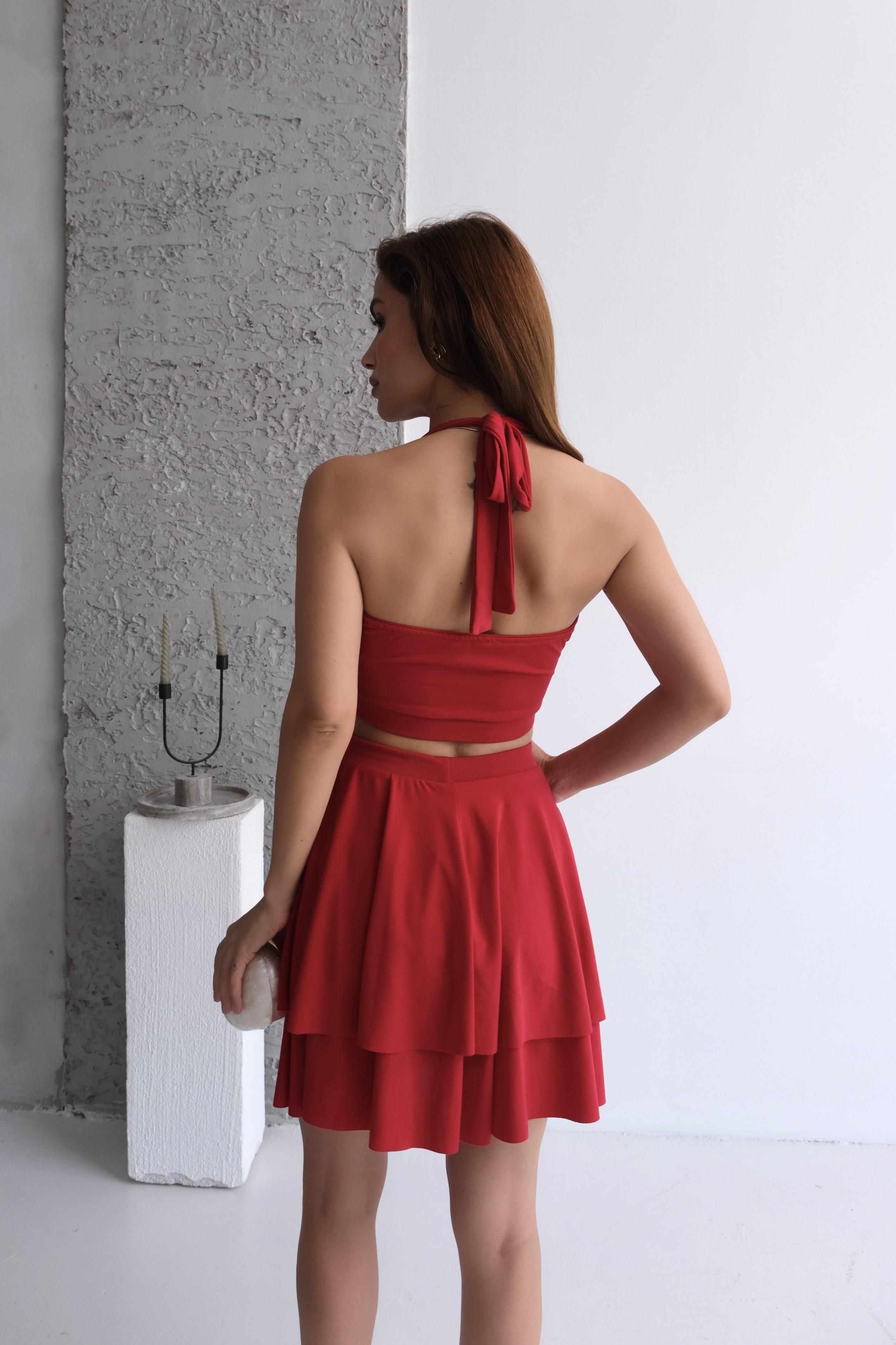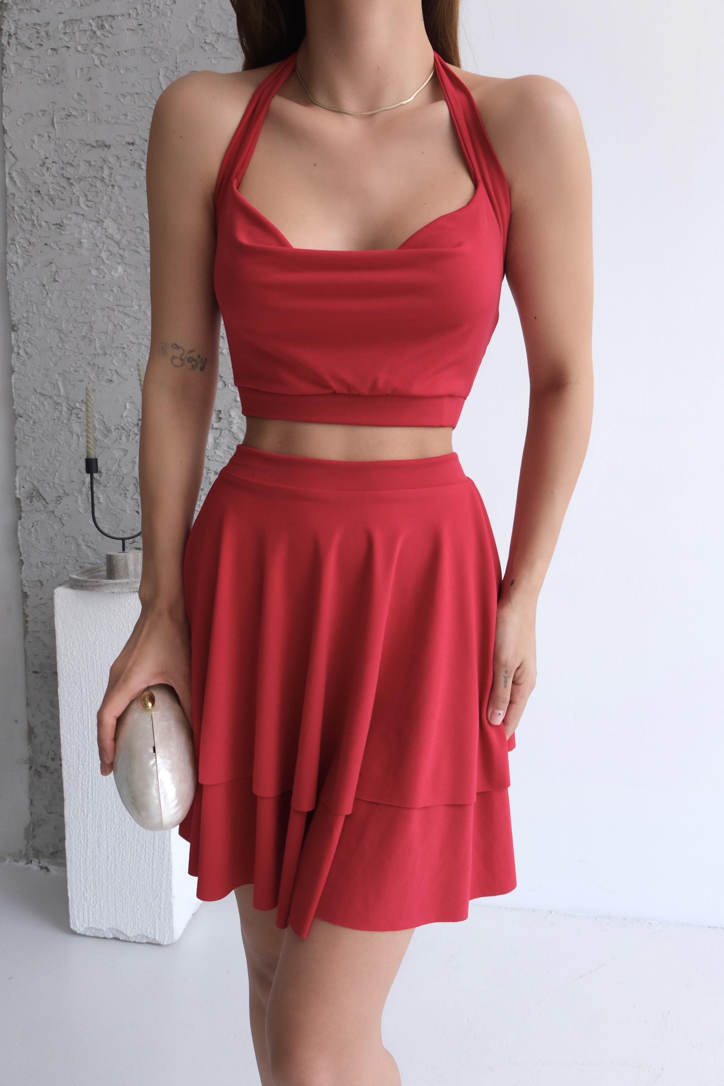 Halter Cowl-Neck Crop Top & Tiered Ruffle Skirt Set - Red (Y-25-7756)