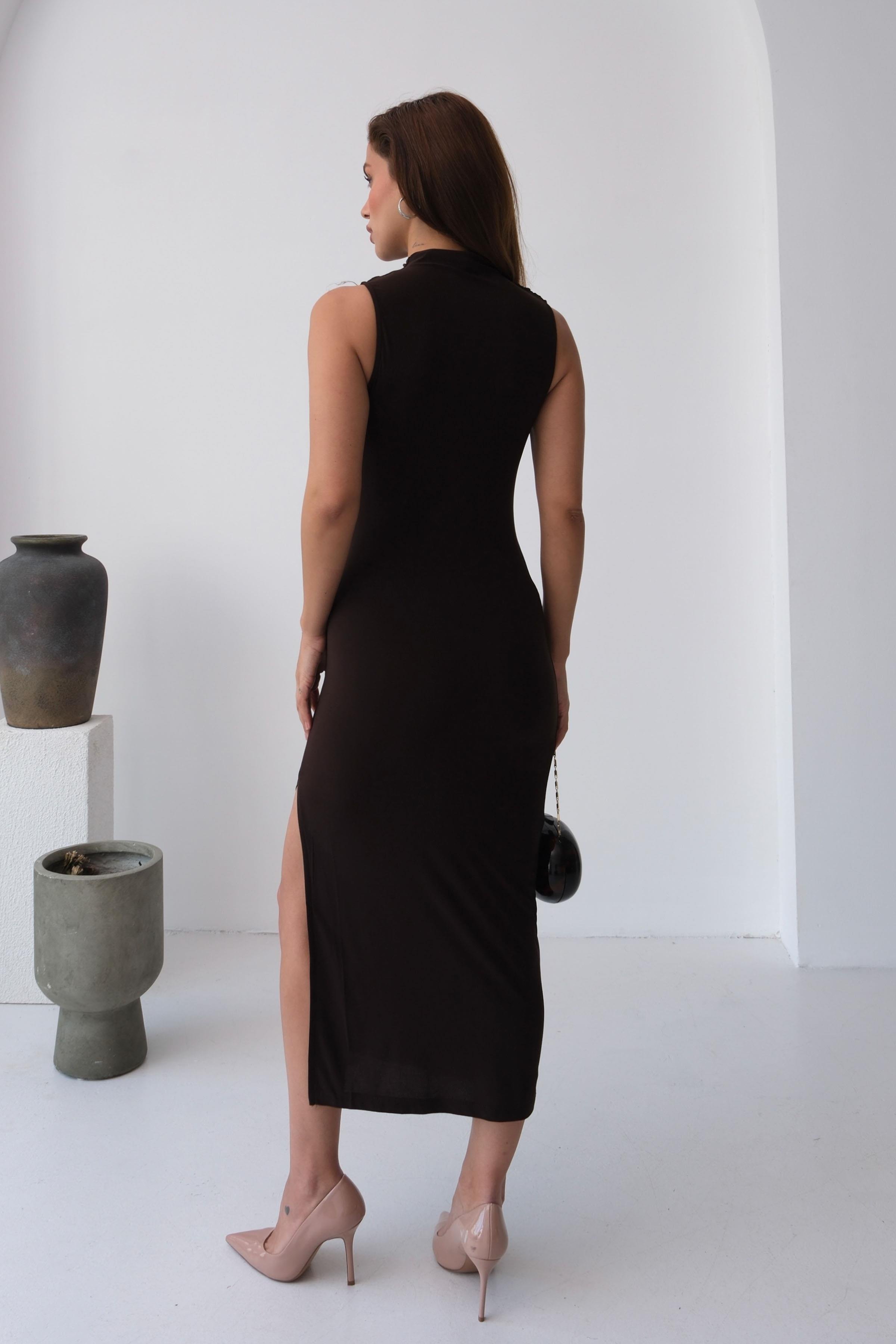 Mock-Neck Sleeveless Sandy Pencil Dress with Draped Waist and Slit – Brown