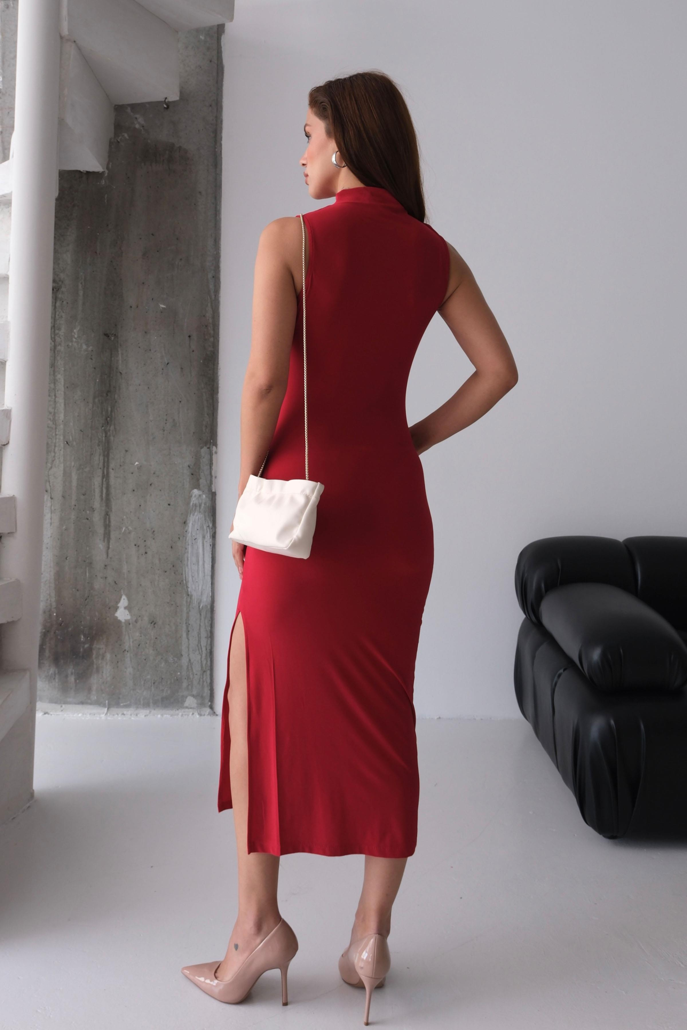Mock-Neck Sleeveless Sandy Pencil Dress with Draped Waist and Slit – Red