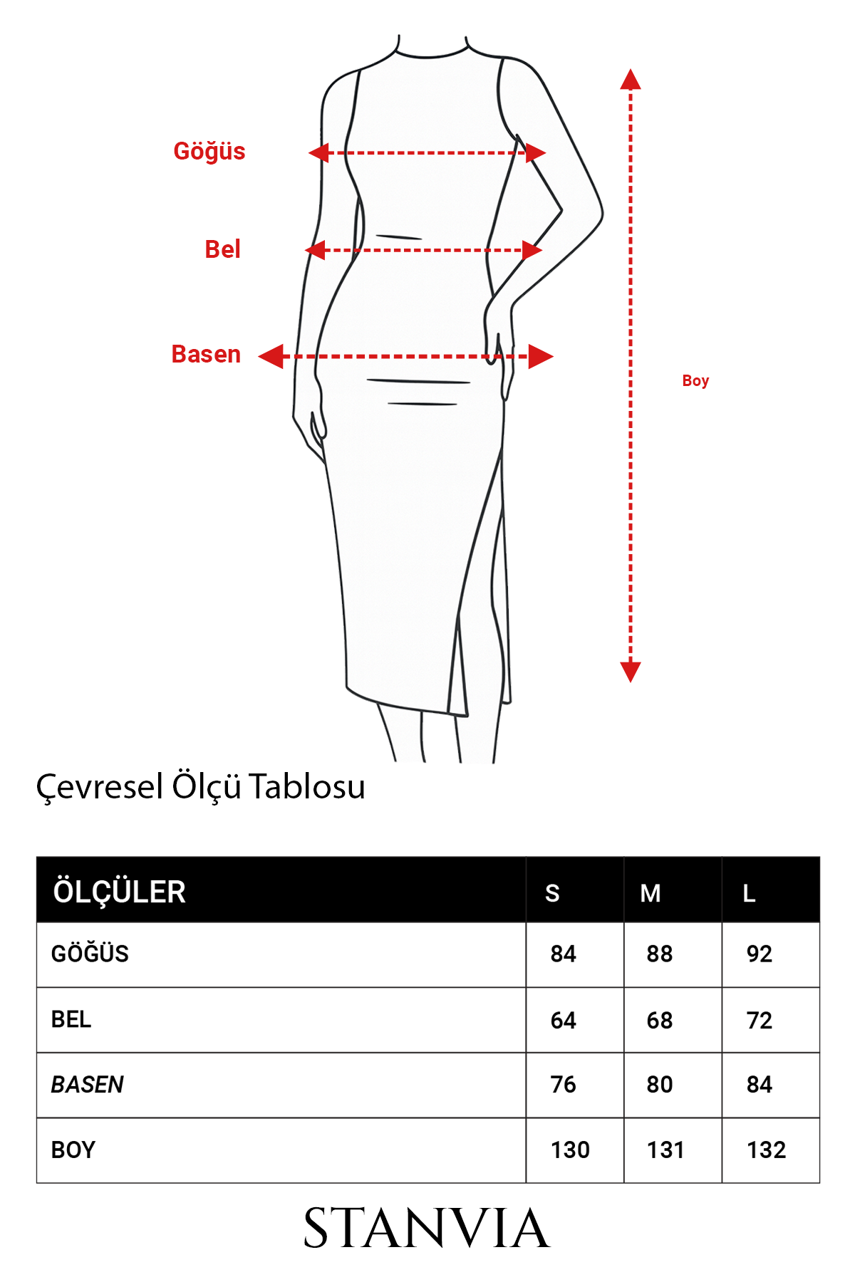 Dik yaka detayı ile güçlü bir duruş sergileyen bu midi elbise, şıklığıyla öne çıkmak isteyenler için idealdir. Diz altı elbise boyu sayesinde dengeli bir görünüm sunan model, hem gündüz hem de gece kombinlerinde rahatlıkla kullanılabilir.