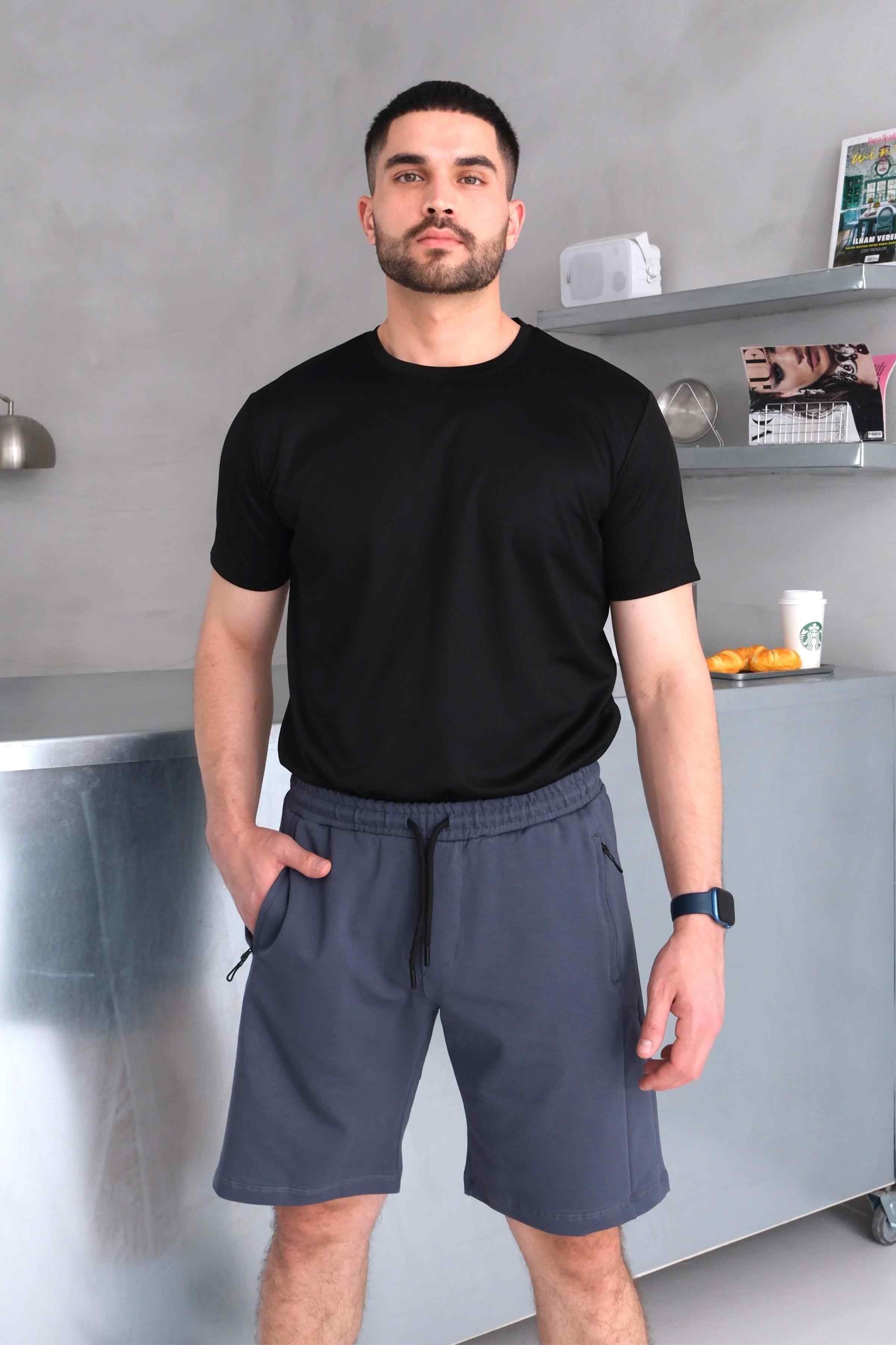 Erkek Beli Lastikli Parçalı Cepli Fermuarlı Şort