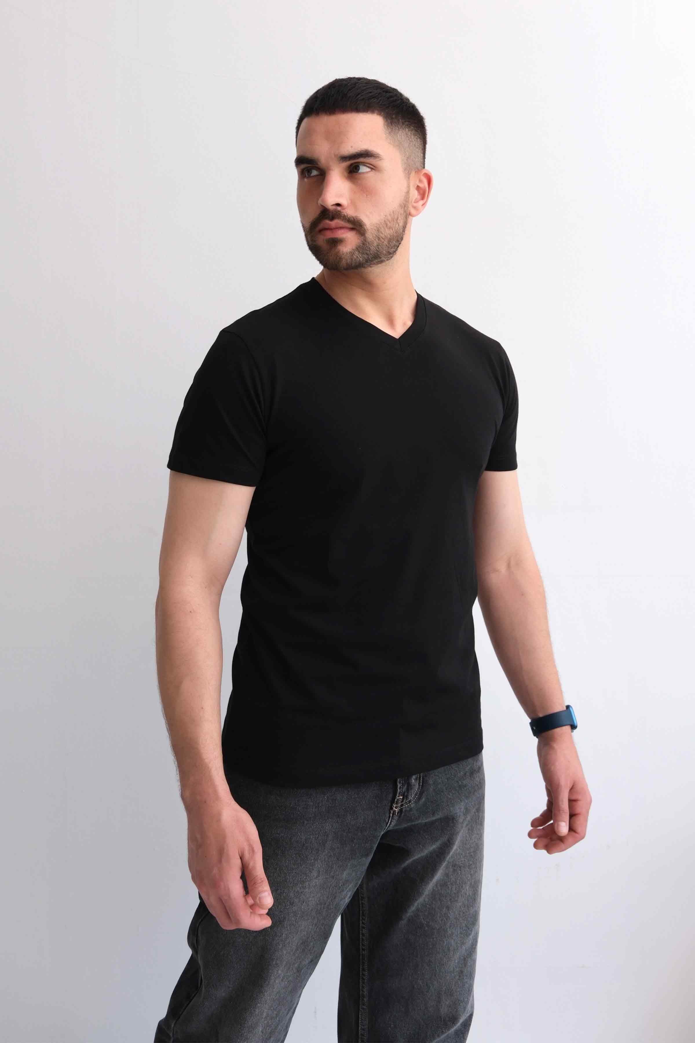 Erkek V Yaka Düz Baskısız %100 Pamuk Basic Tişört