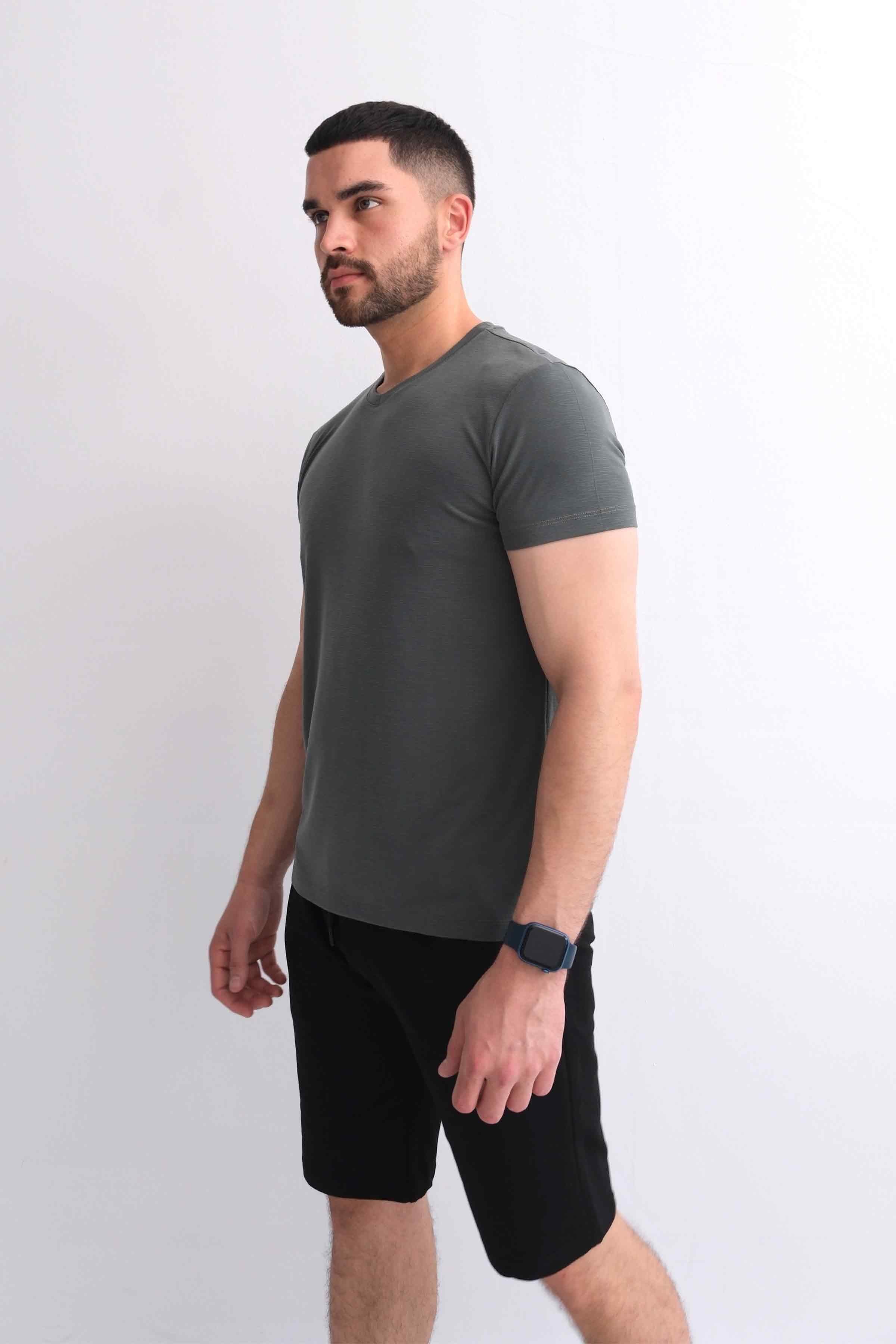 Men’s V-Neck Slub Modal-Cotton Regular Fit Basic T-Shirt - Khaki (Y-25-4177)