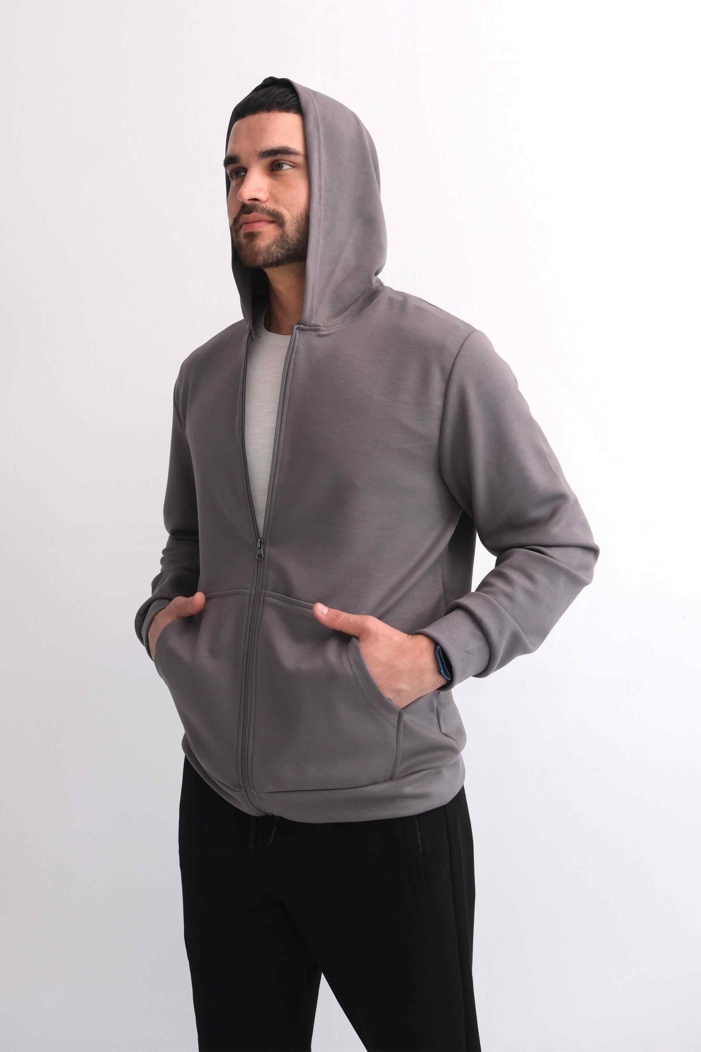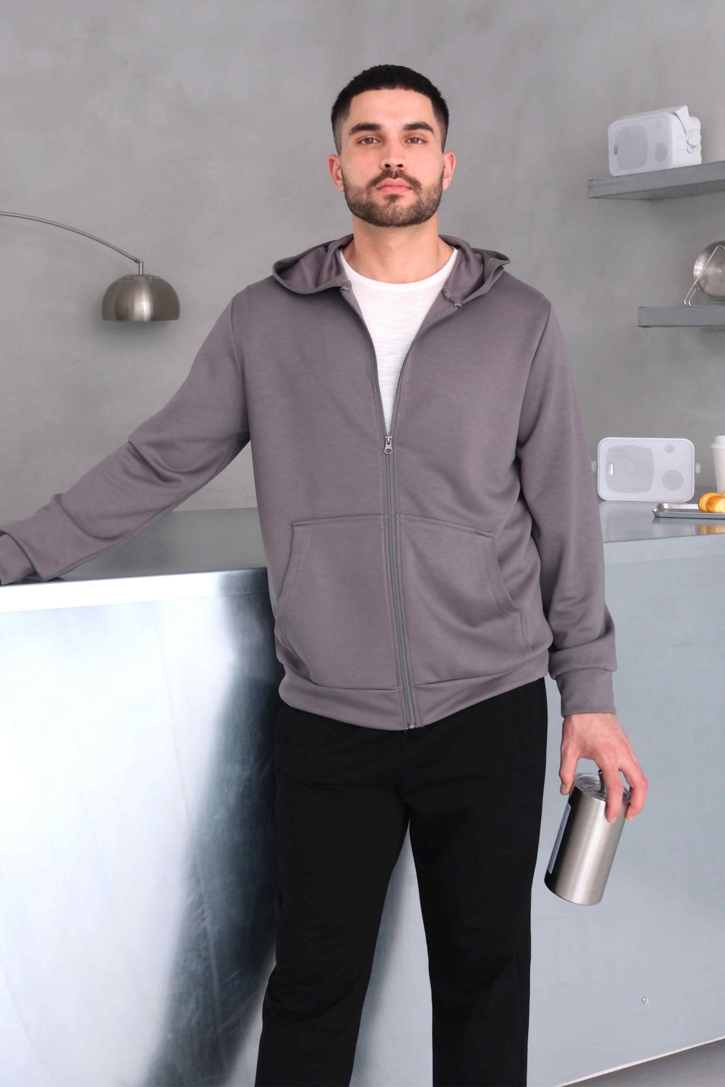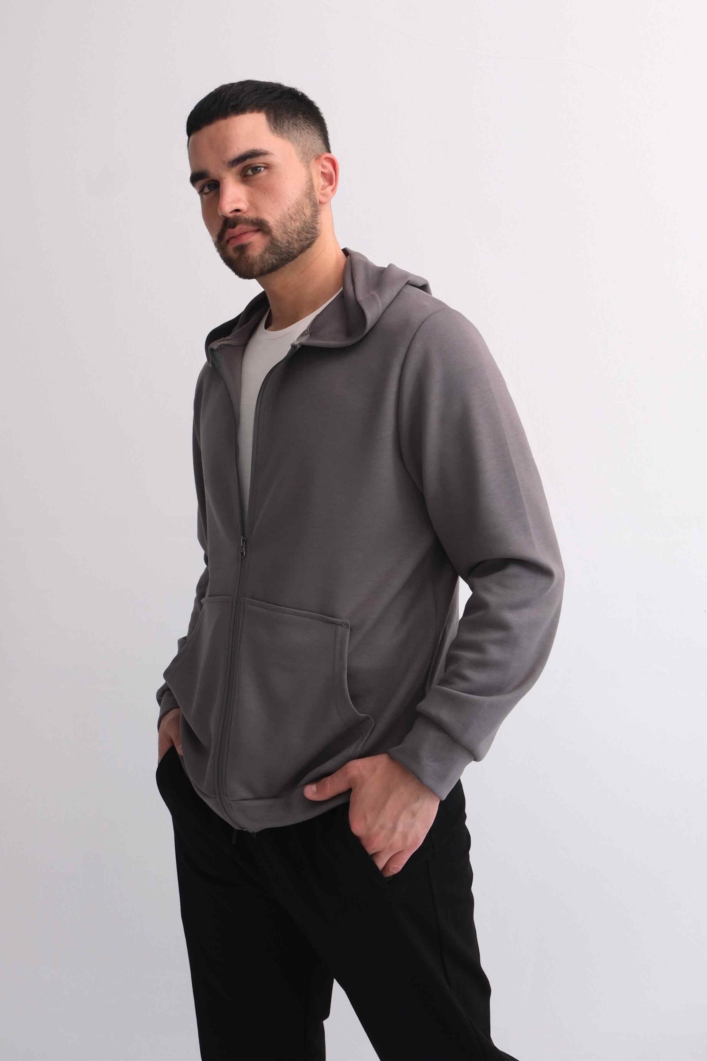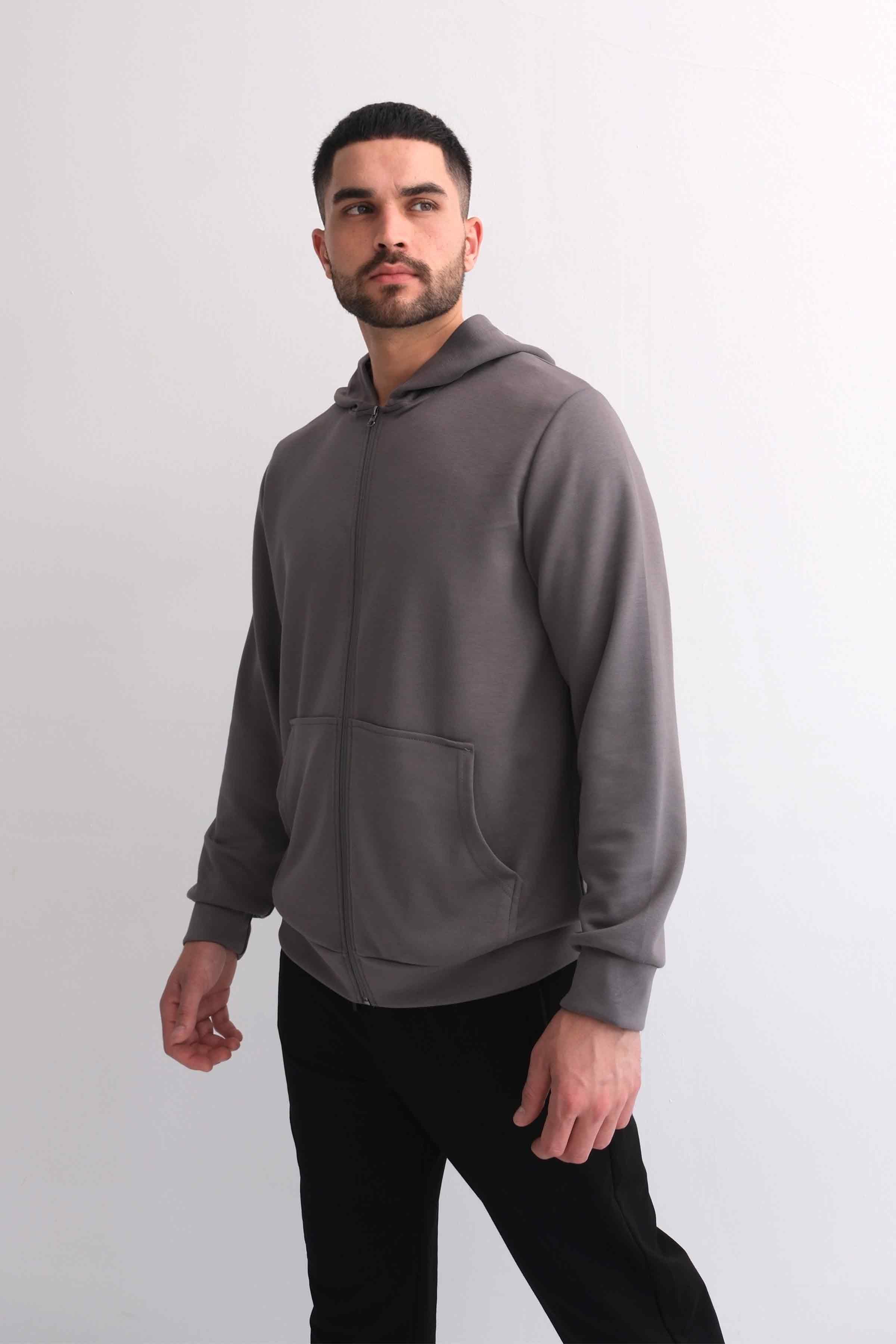 Zip-Up Modal Hoodie with Kangaroo Pocket - Grey