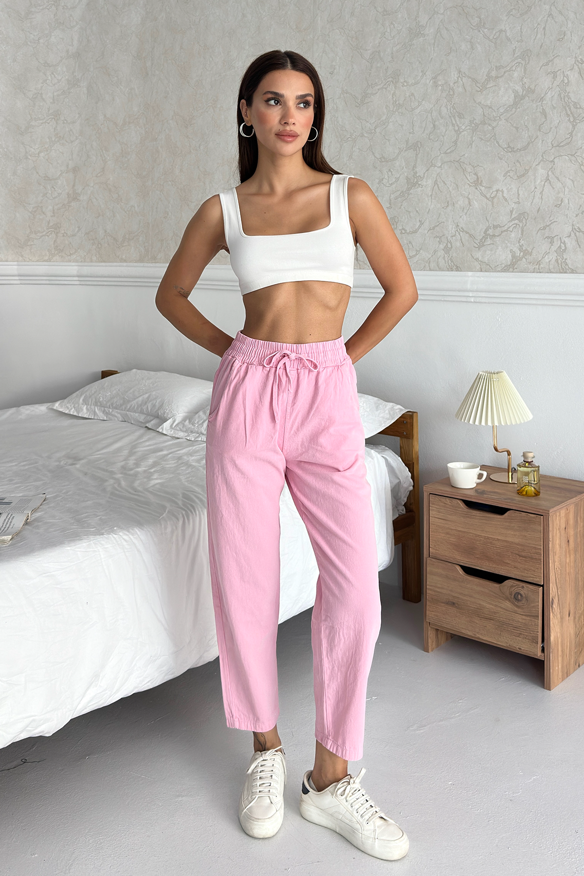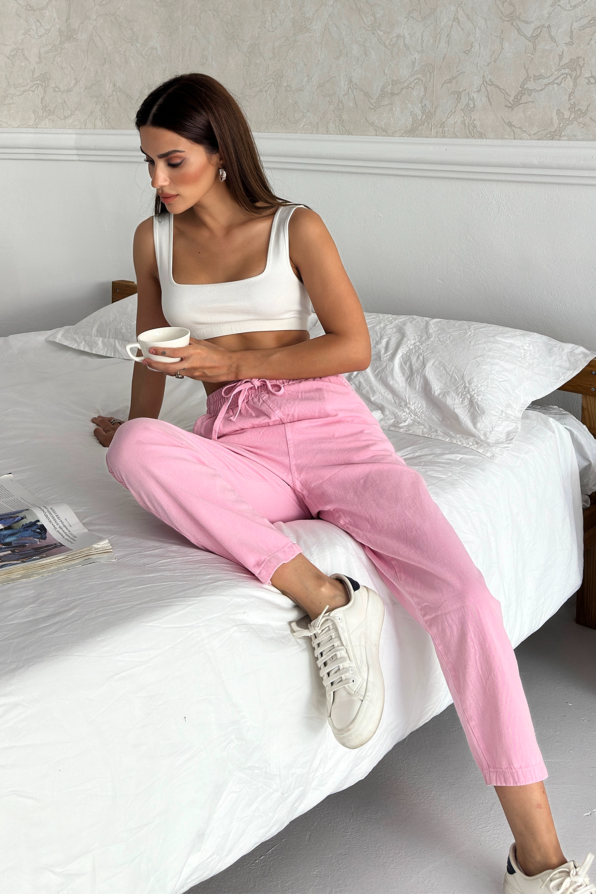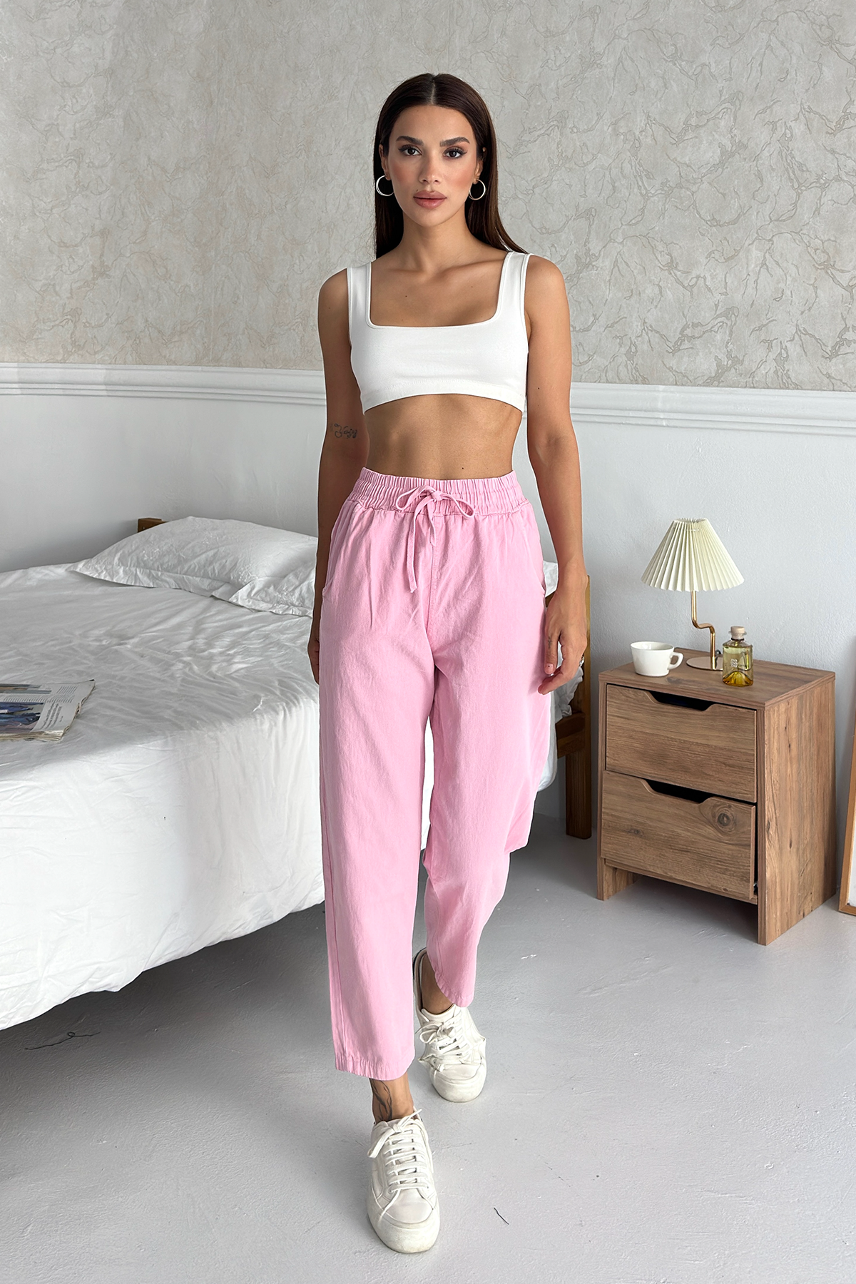 Modern kesimiyle öne çıkan bu pantolon, rahat kalıp ve düz paça tasarımı sayesinde her tarza uyum sağlar. Yüksek bel pantolon formu hem vücut hatlarını zarif bir şekilde ortaya çıkarır hem de gün boyu konfor sunar. Ayrıca beli bağcıklı kadın pantolon detayı sayesinde kişiselleştirilebilir bir kullanım sunarak rahatlıkla ayarlanabilir.
