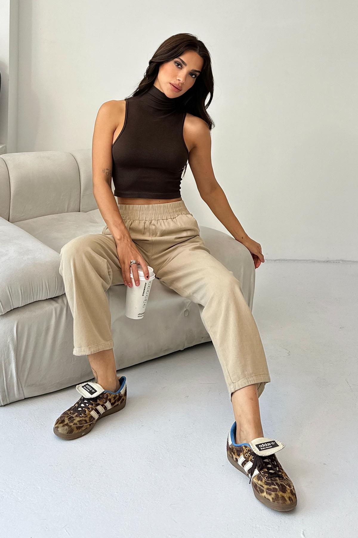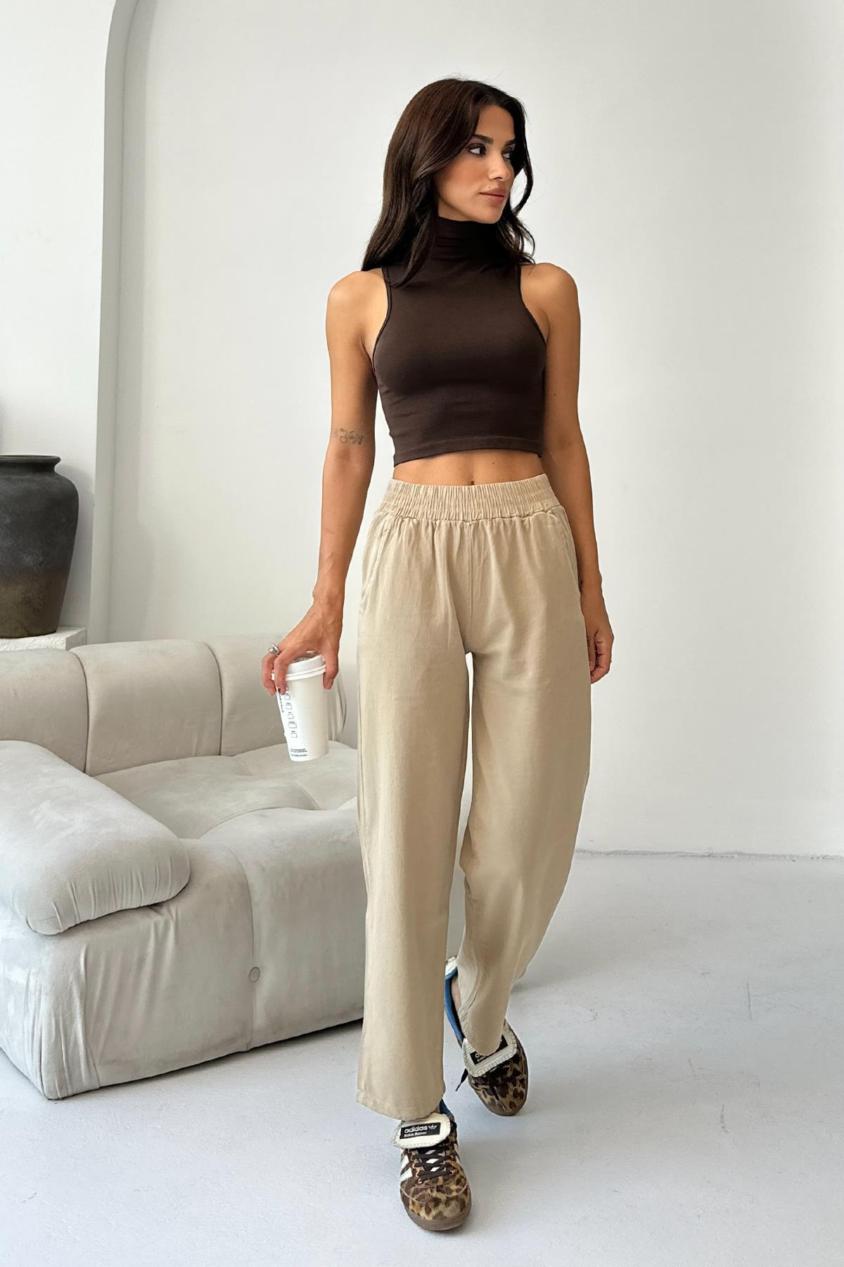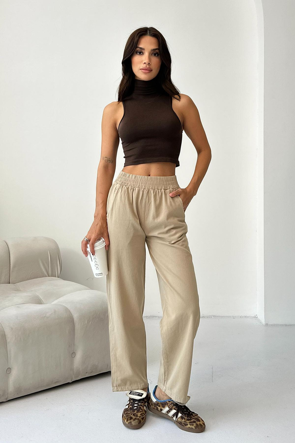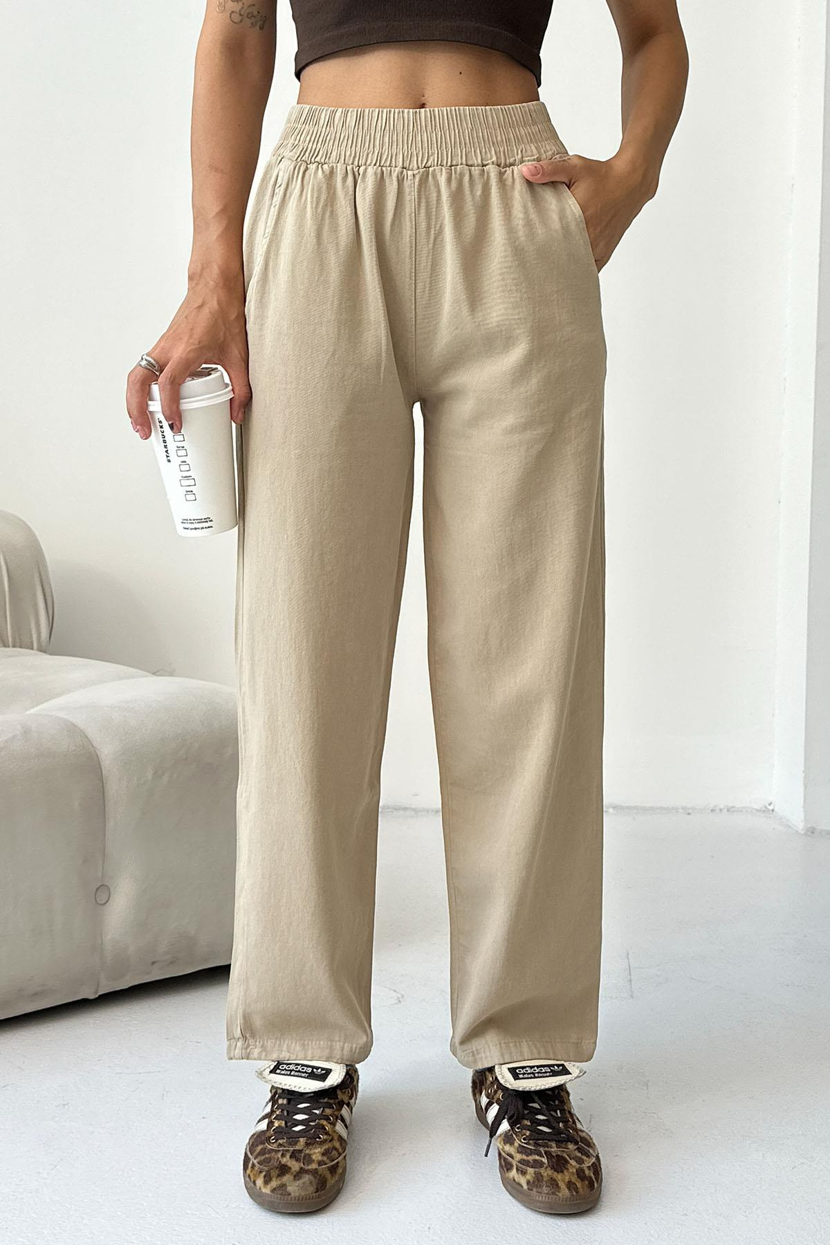 Gabardine High-Waist 100% Cotton Straight-Leg Pants – Beige (Y-25-6702)