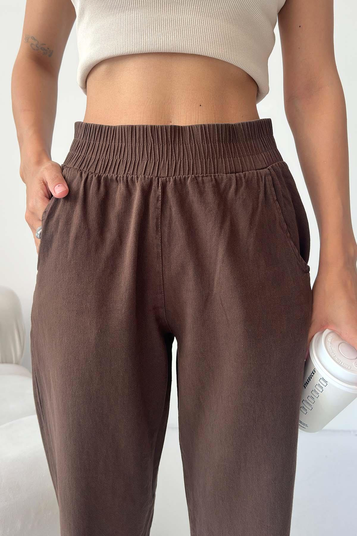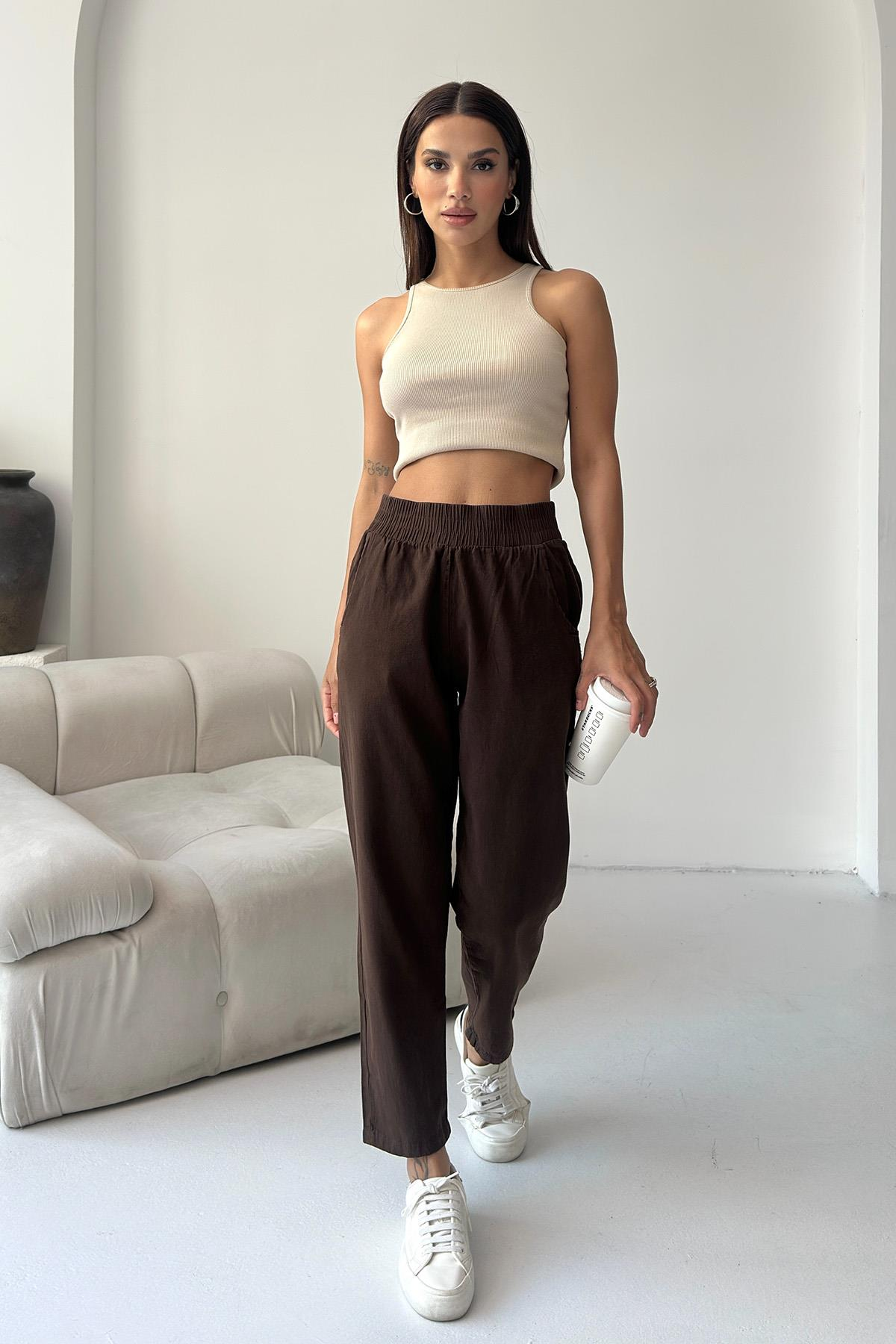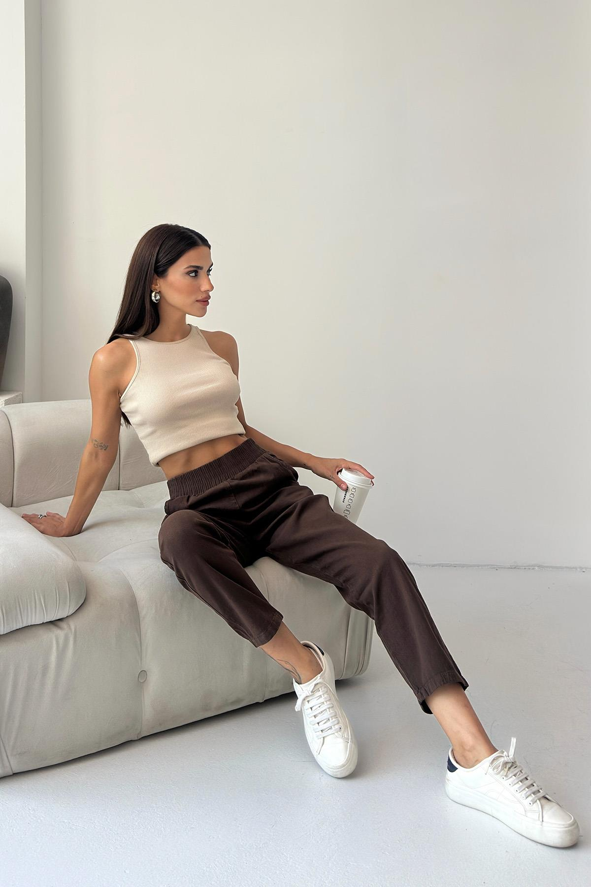Gabardine High-Waist 100% Cotton Straight-Leg Pants – Brown (Y-25-6702)