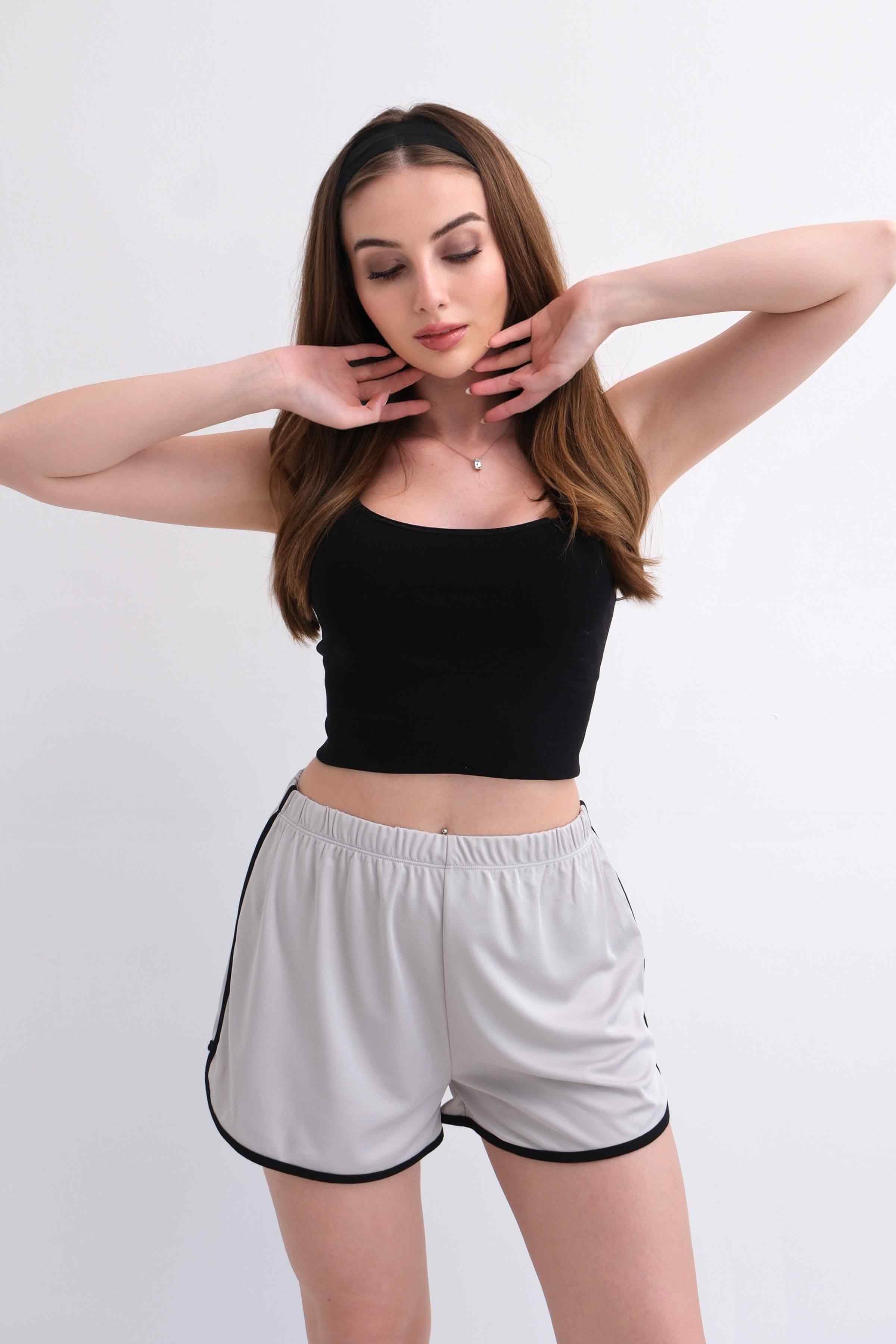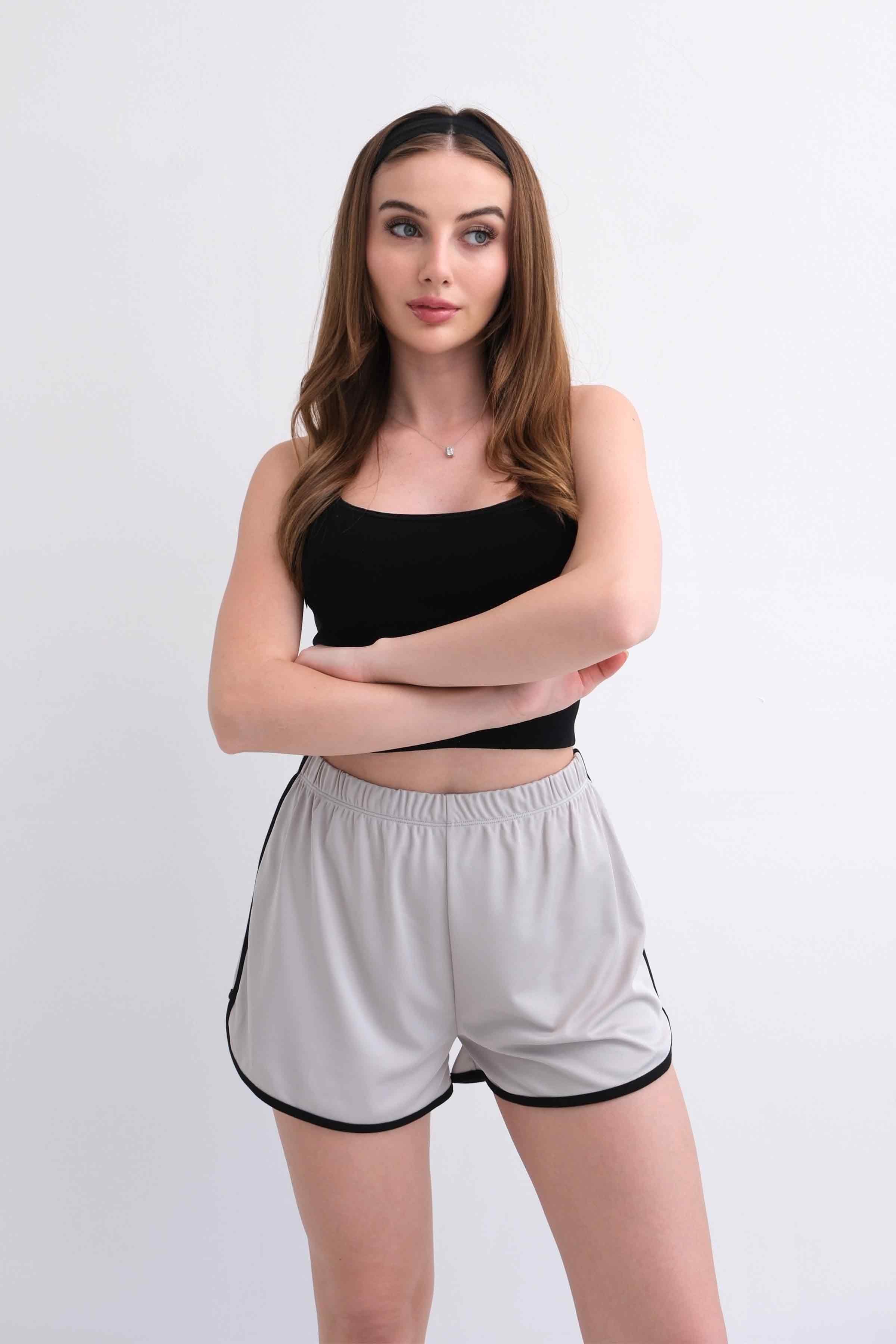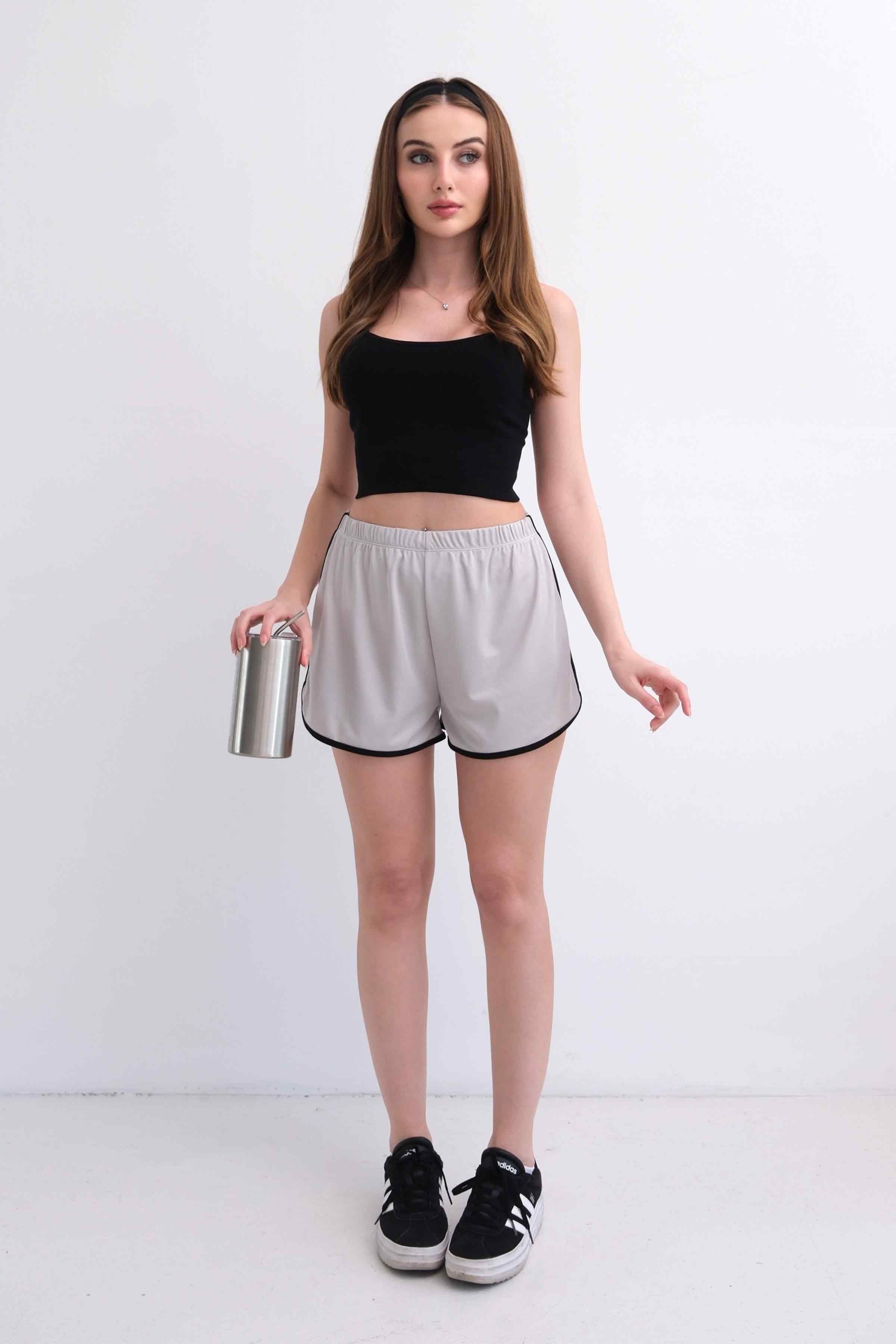 Women’s Elastic-Waist Scuba Athletic Shorts with Piping – Light Grey (Y-25-7767)