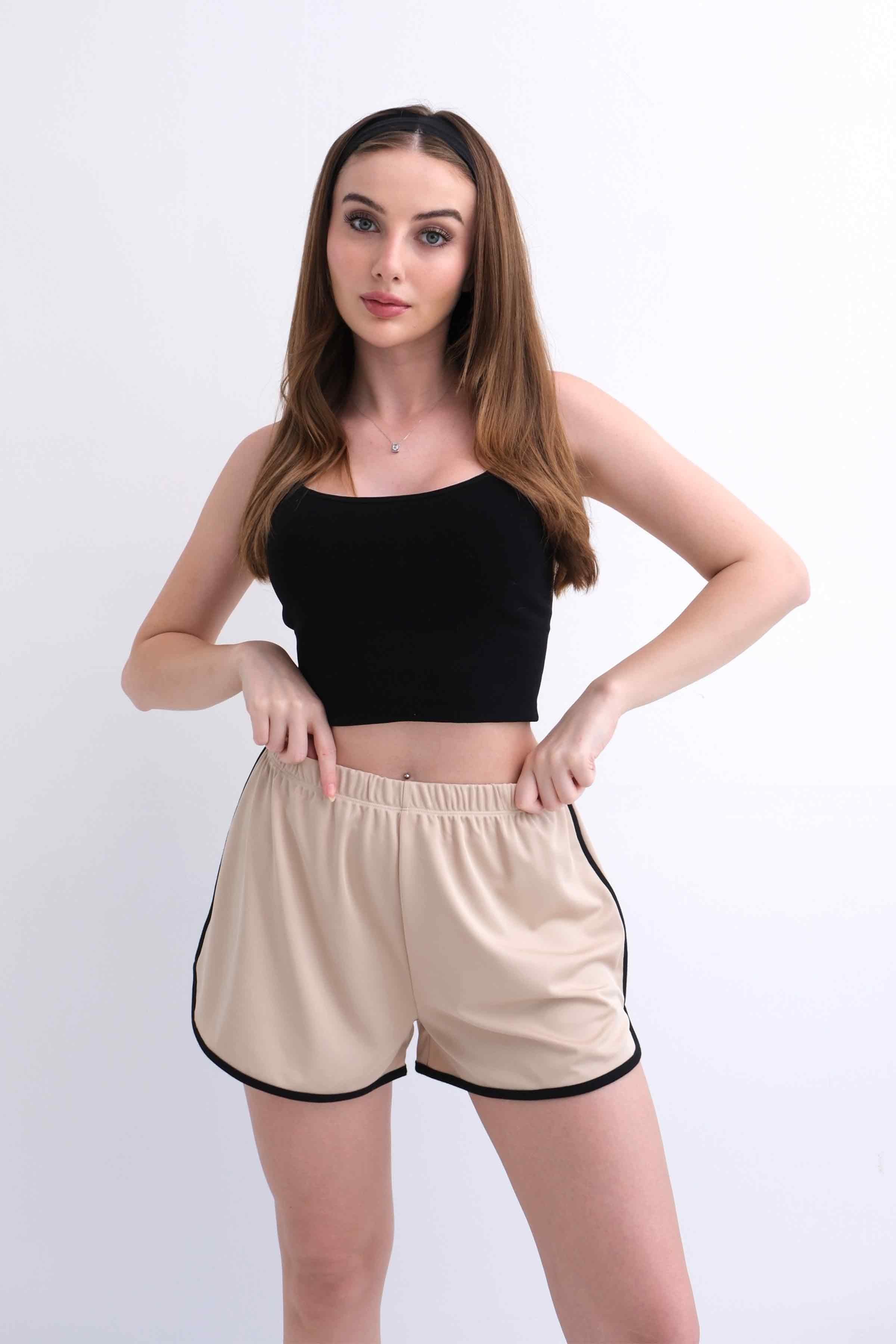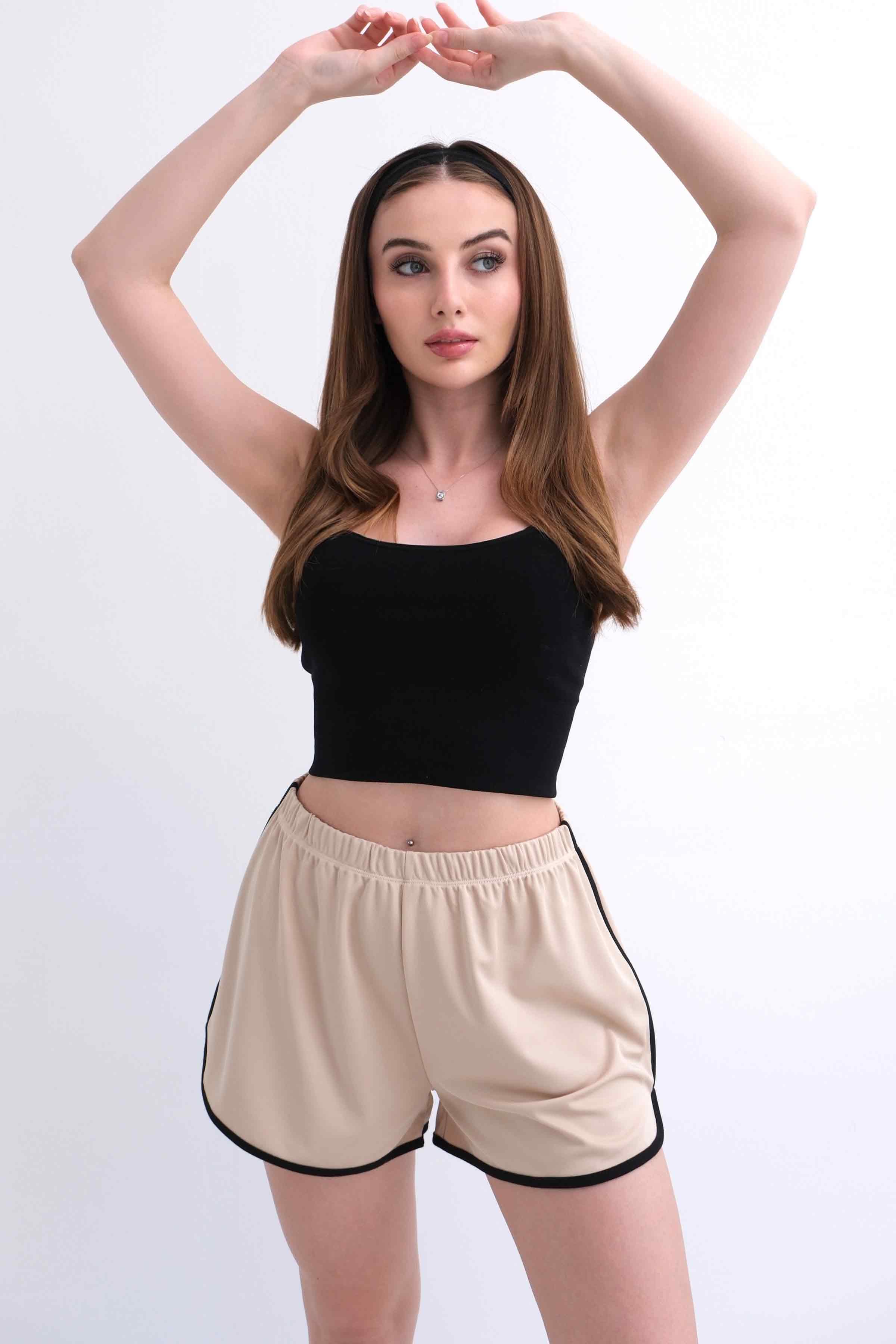 Women’s Elastic-Waist Scuba Athletic Shorts with Piping – Beige (Y-25-7767)