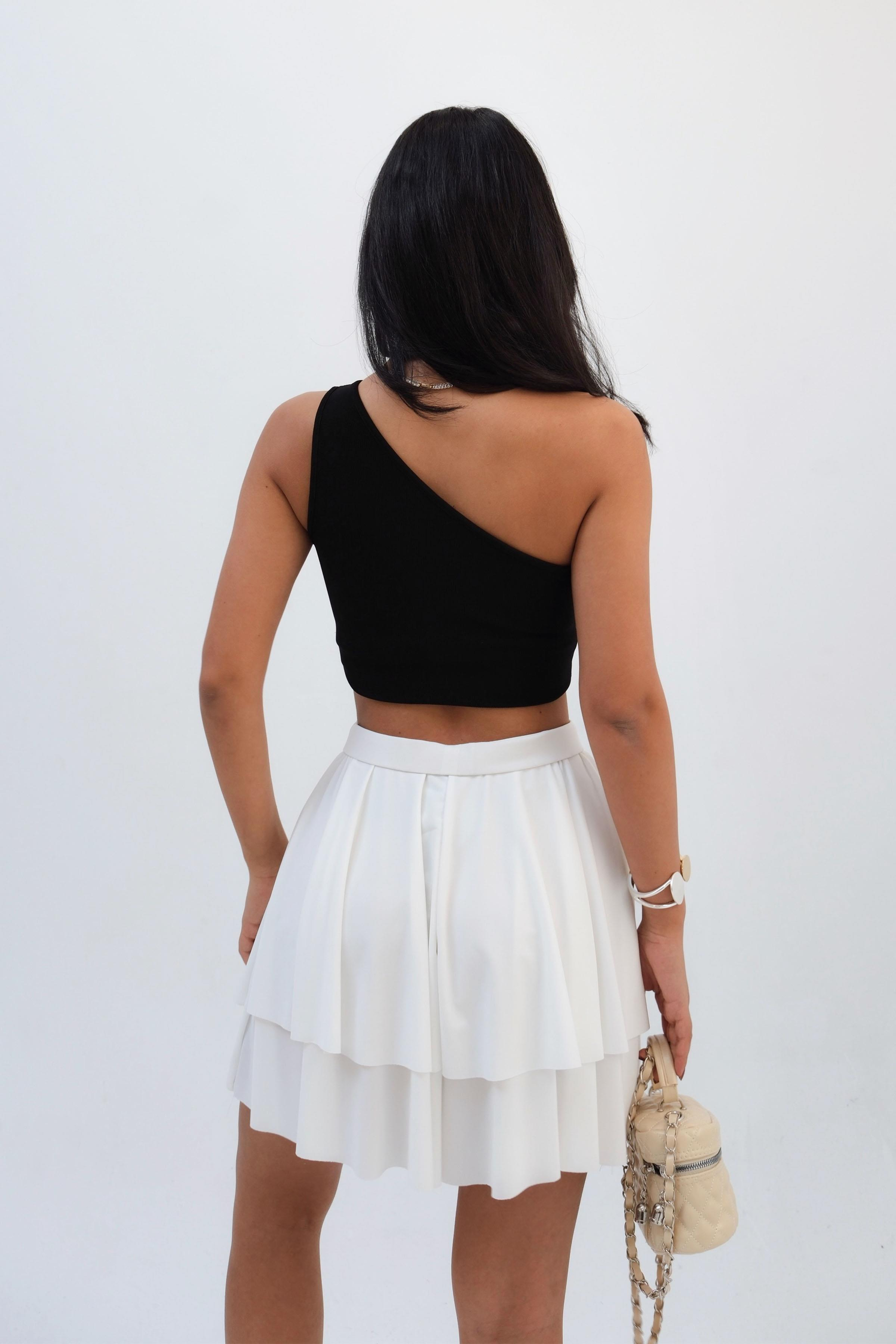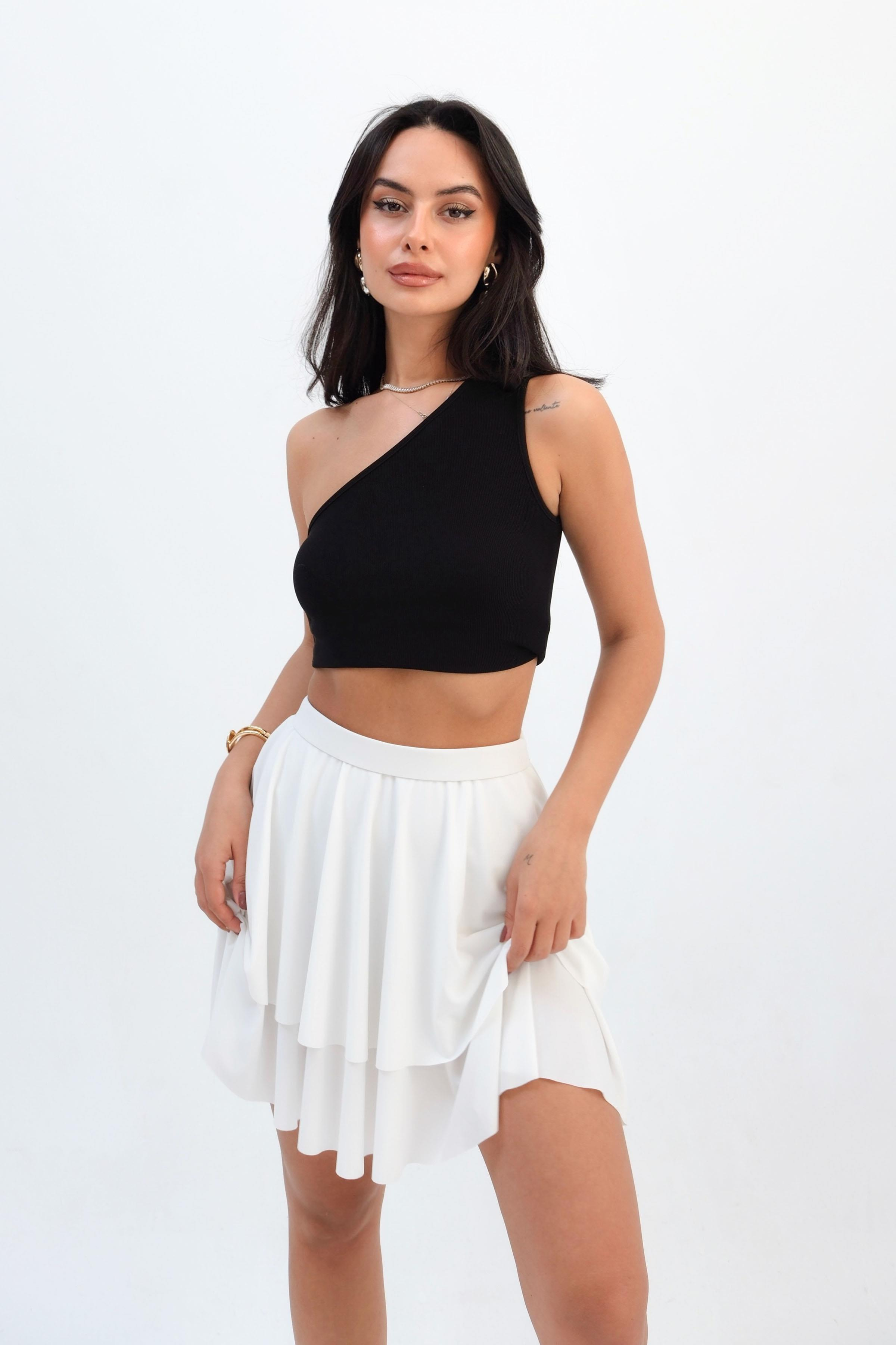Gardırobunuzun kurtarıcı parçalarından biri olacak bu model, hem spor ayakkabılarla kombinlenebilecek şirin bir günlük kısa etek, hem de topuklularla tamamlandığında zarif bir fırfırlı etek görünümü sunar.