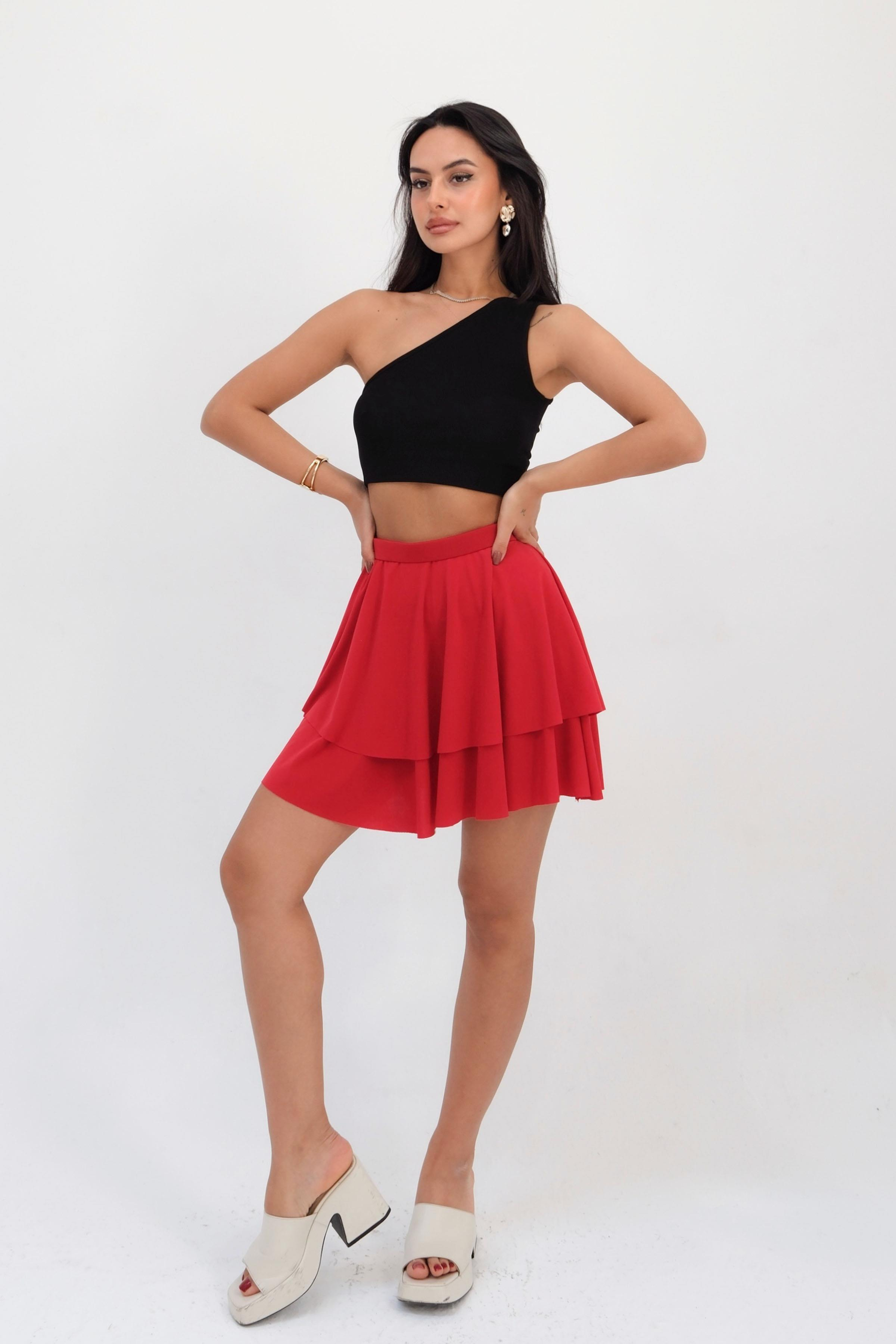 Kadın Beli Lastikli Kat Kat Fırfırlı Volanlı Mini Etek