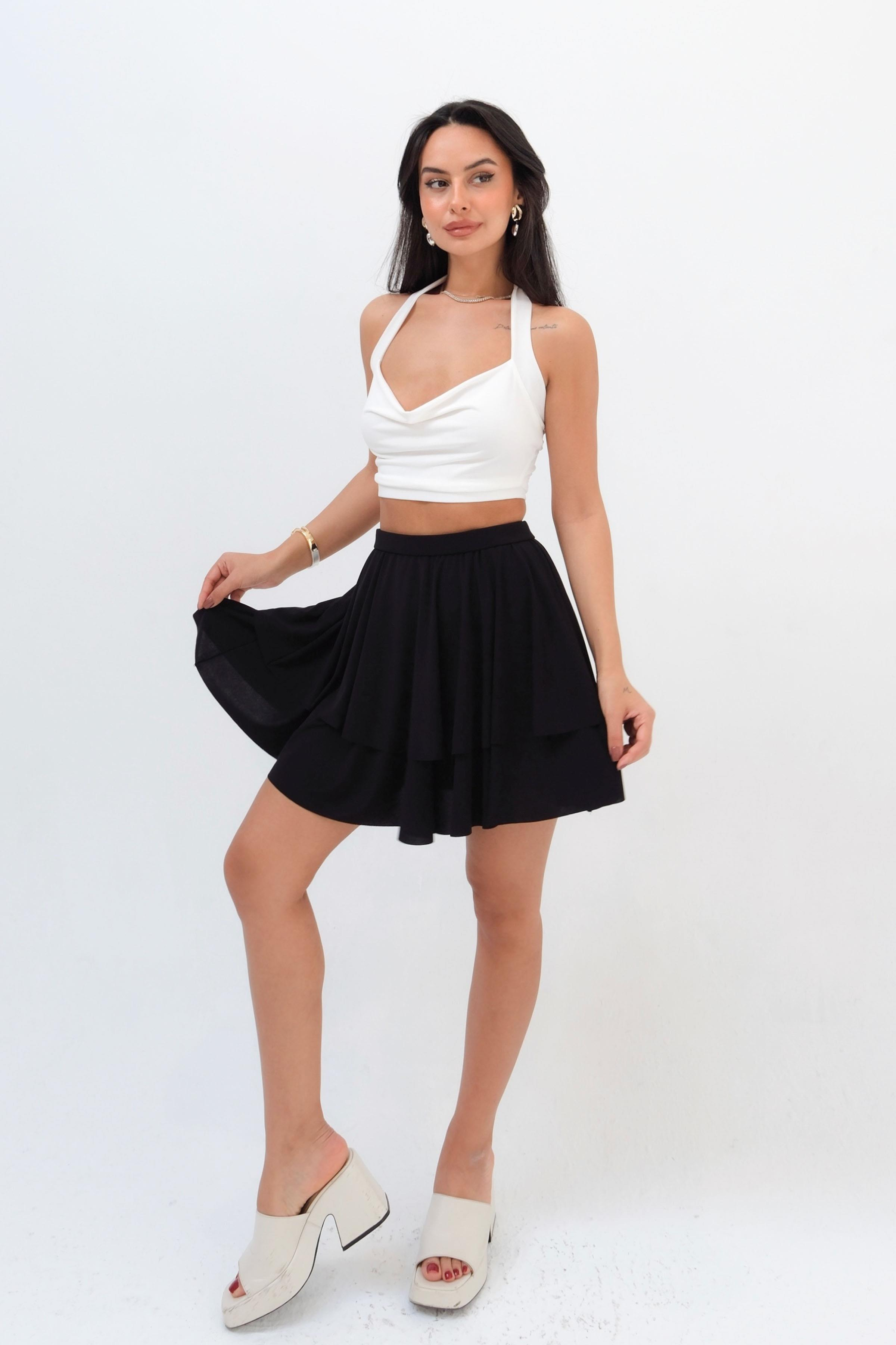 Kadın Beli Lastikli Kat Kat Fırfırlı Volanlı Mini Etek