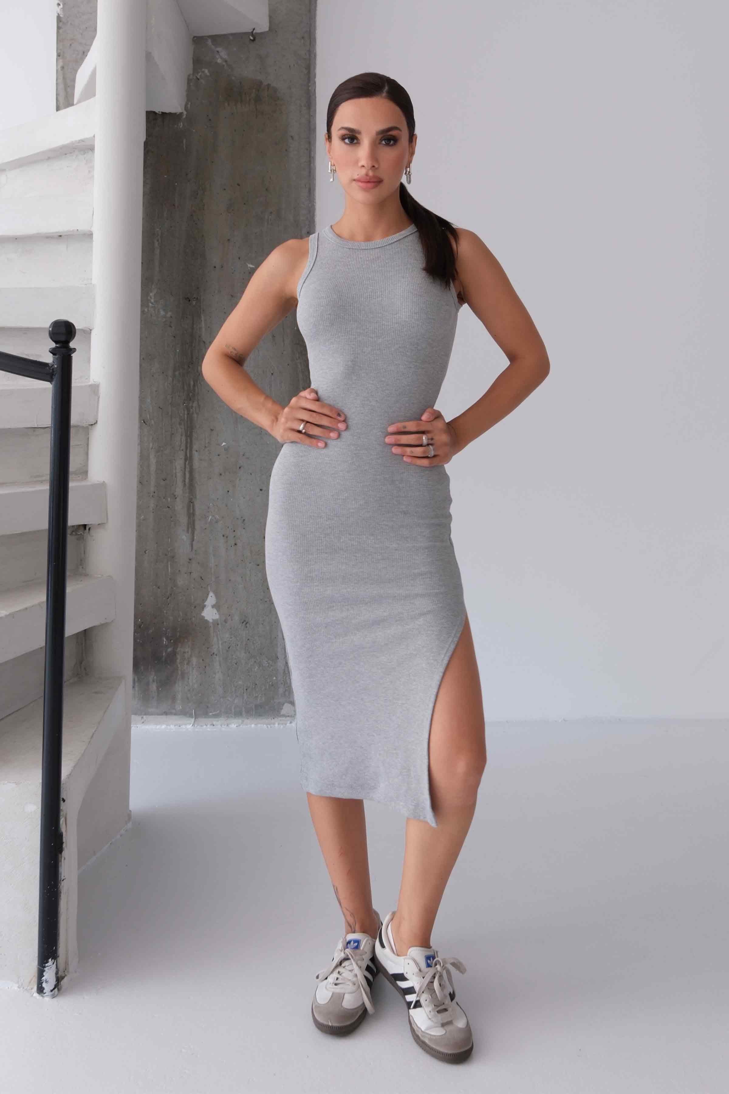 Women’s Halter-Neck Ribbed Midi Pencil Dress – Grey