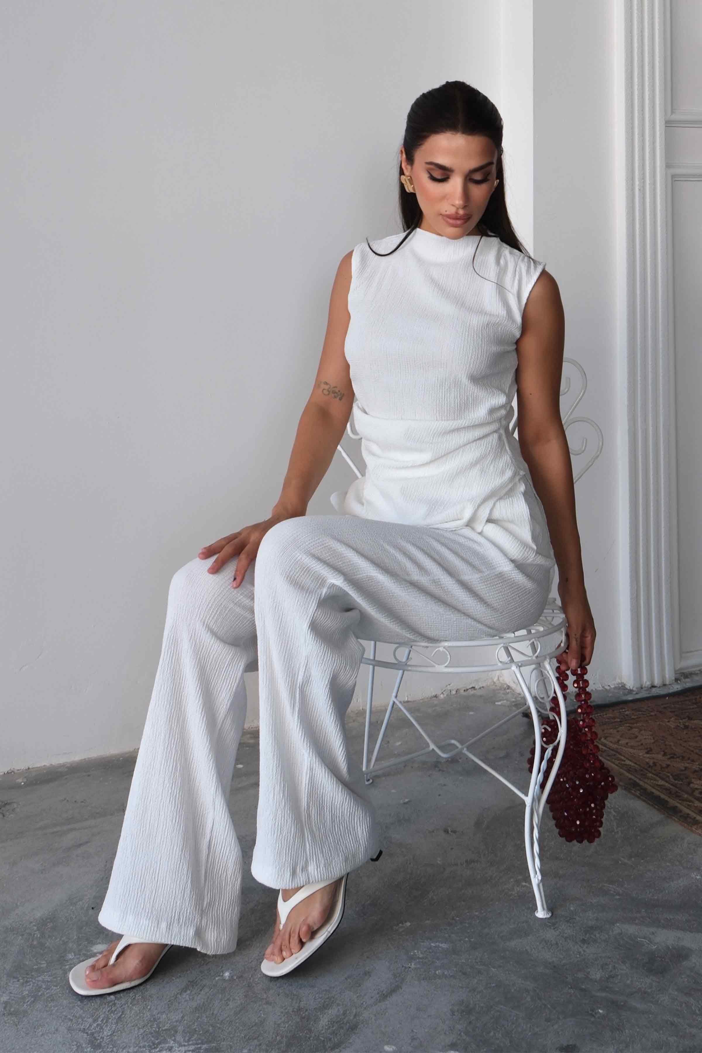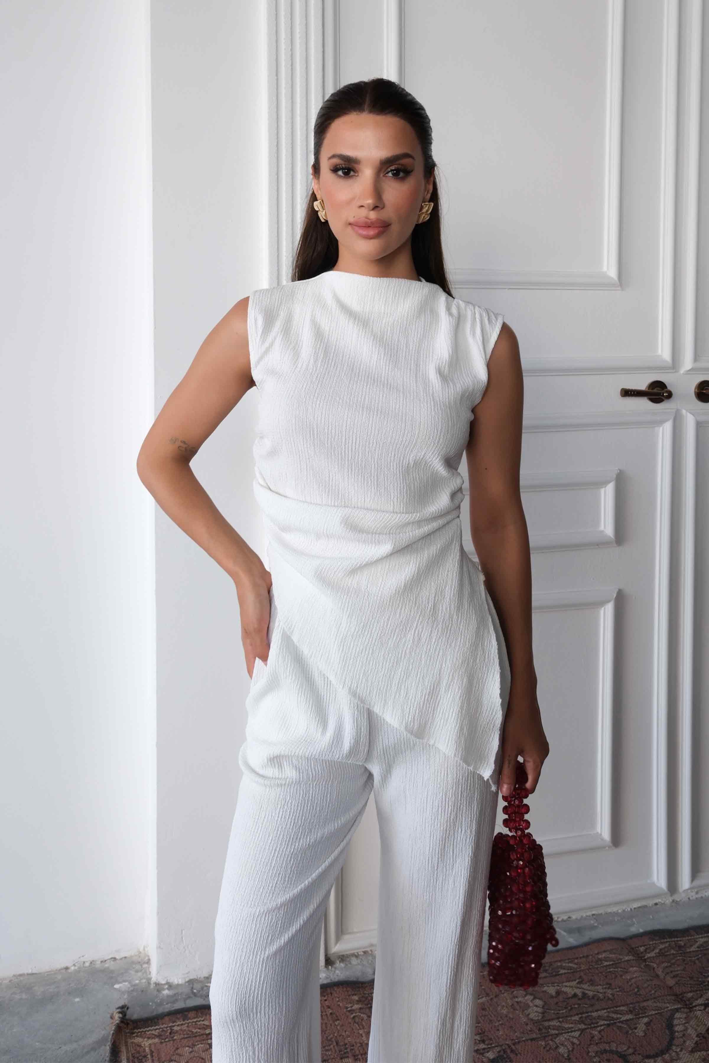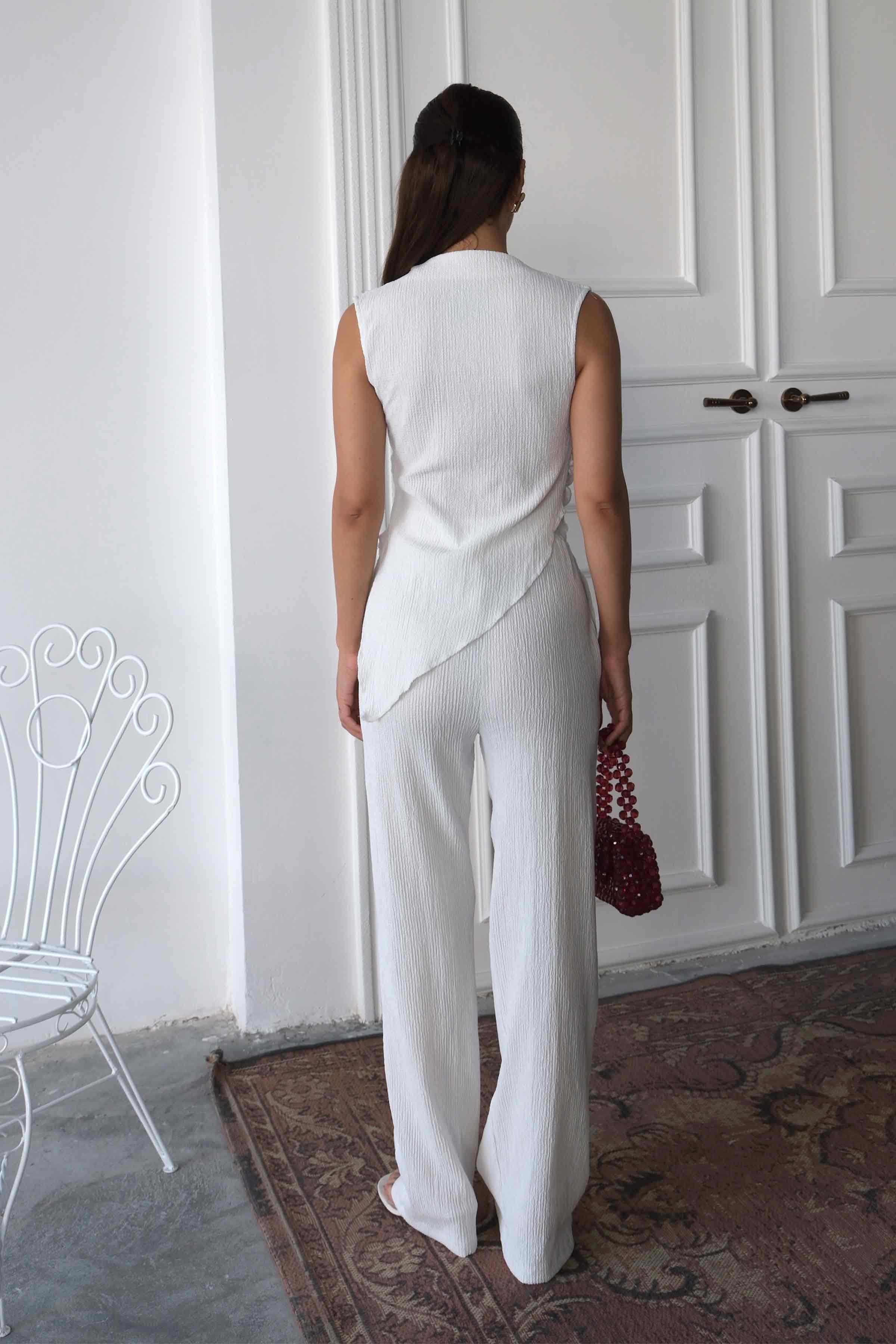 Hem rahat ve ferah kumaş dokusu hem de minimal tasarımıyla stilinize sofistike bir hava katacak bu takım, topuklu ayakkabı ya da düz sandaletlerle kolayca kombinlenebilir.
