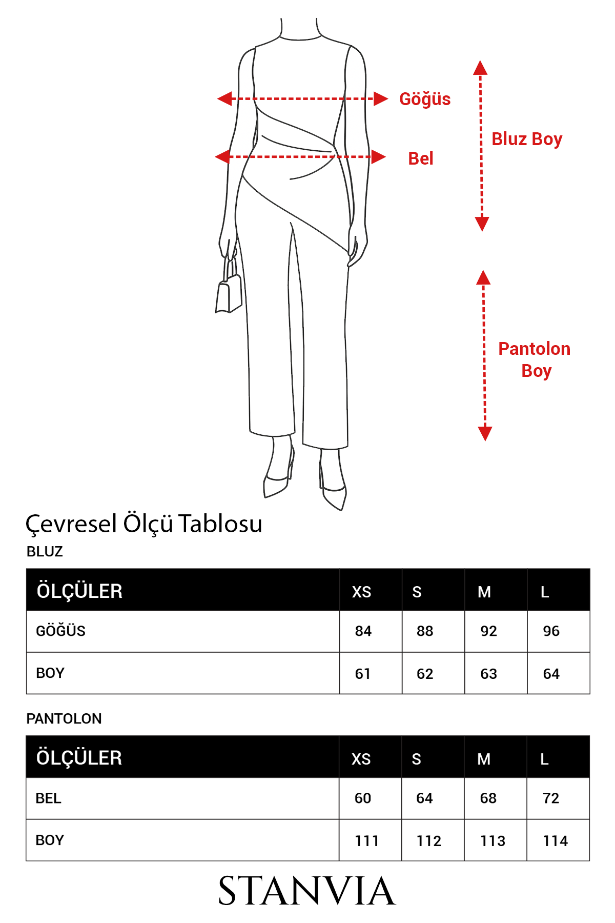 Modern kesimiyle öne çıkan bu kadın takım, ister ofis şıklığında ister akşam yemeğinde giyilecek takım olarak zarif kombinler yapmanıza yardımcı olur. Geniş kesimli pantolonu ve rahat oturuşlu bluzu sayesinde hareket özgürlüğü sunan tasarımı, günlük hayatta giyilecek takım alternatifi olarak da gardırobunuzun kurtarıcı parçalarından biri olacak.