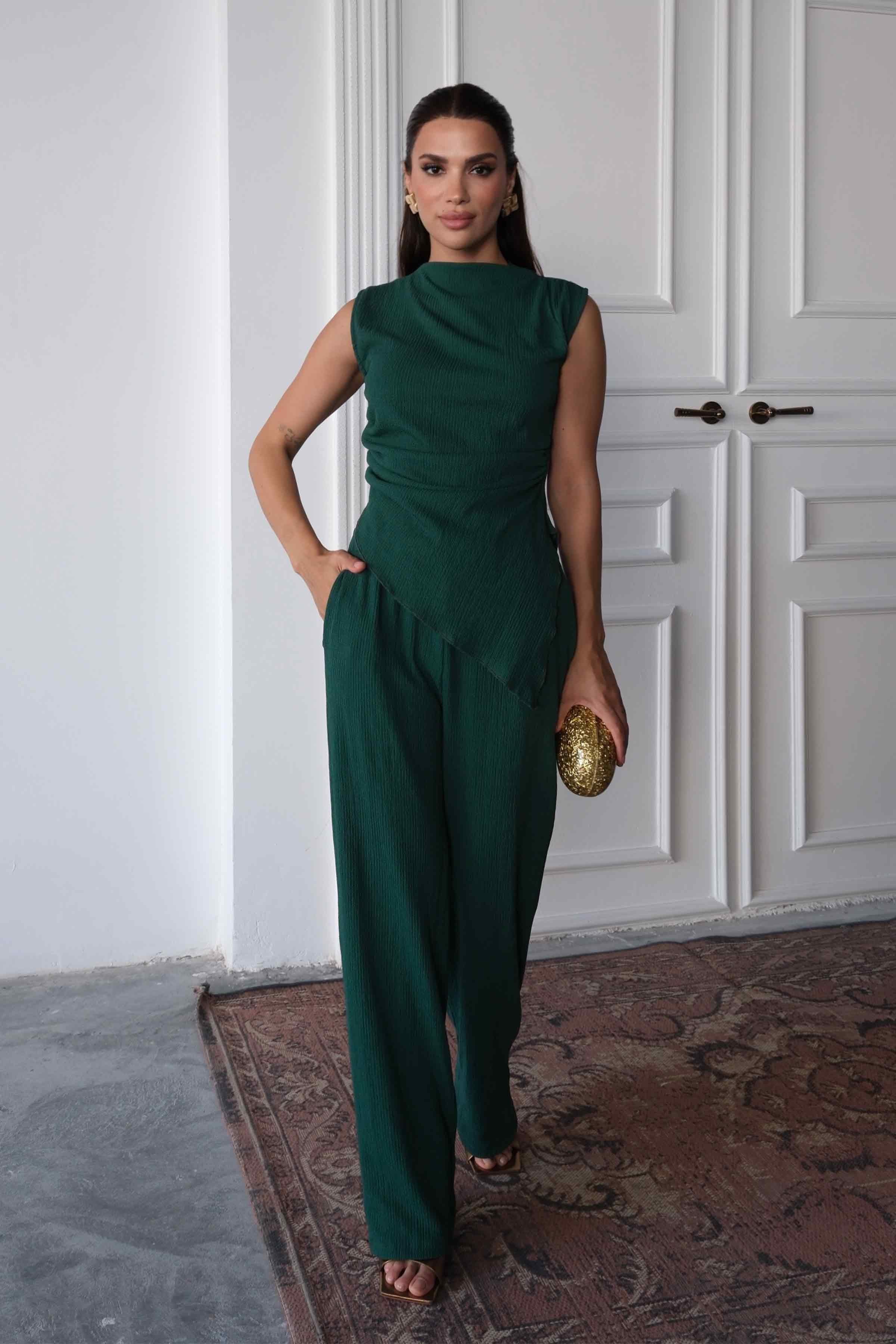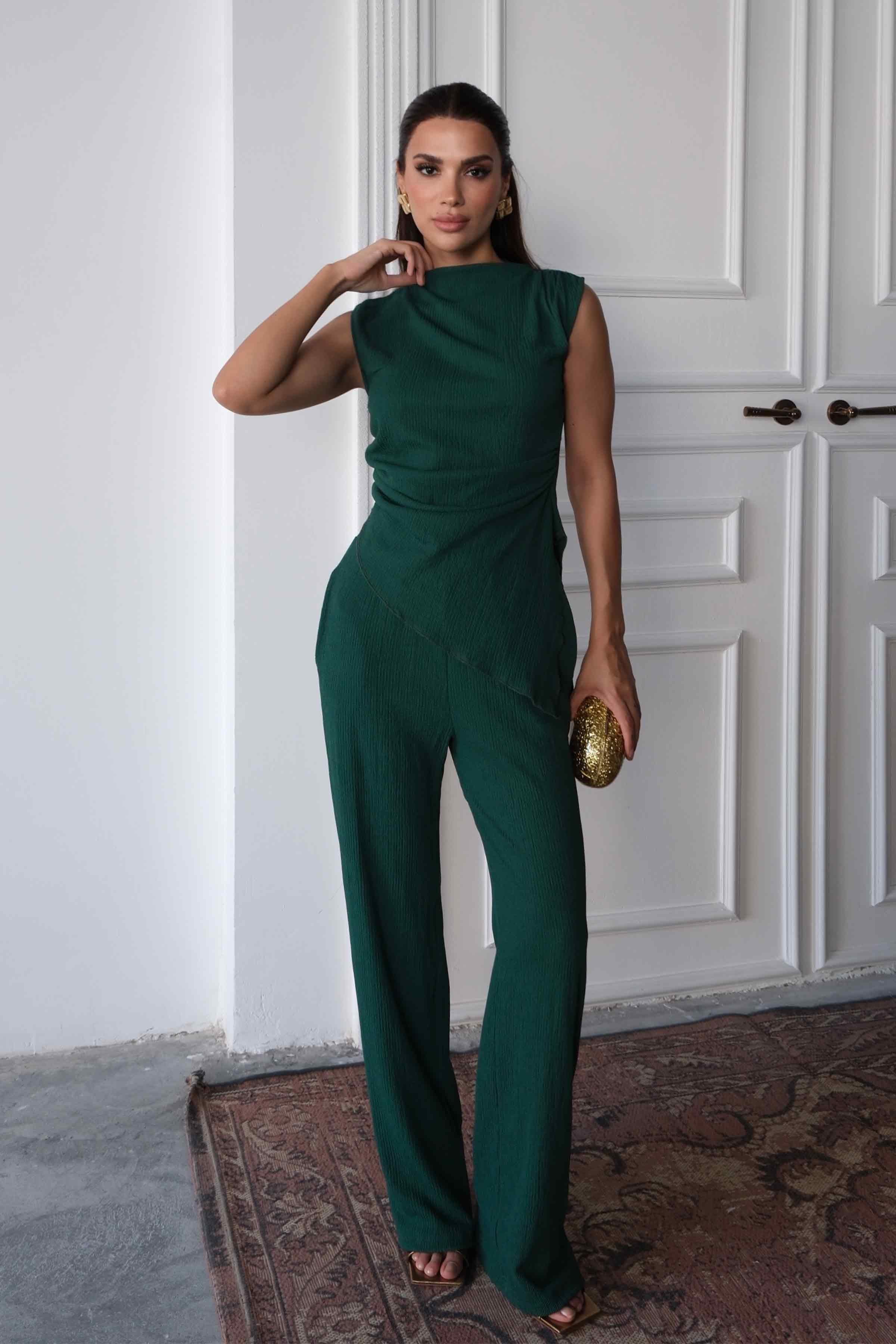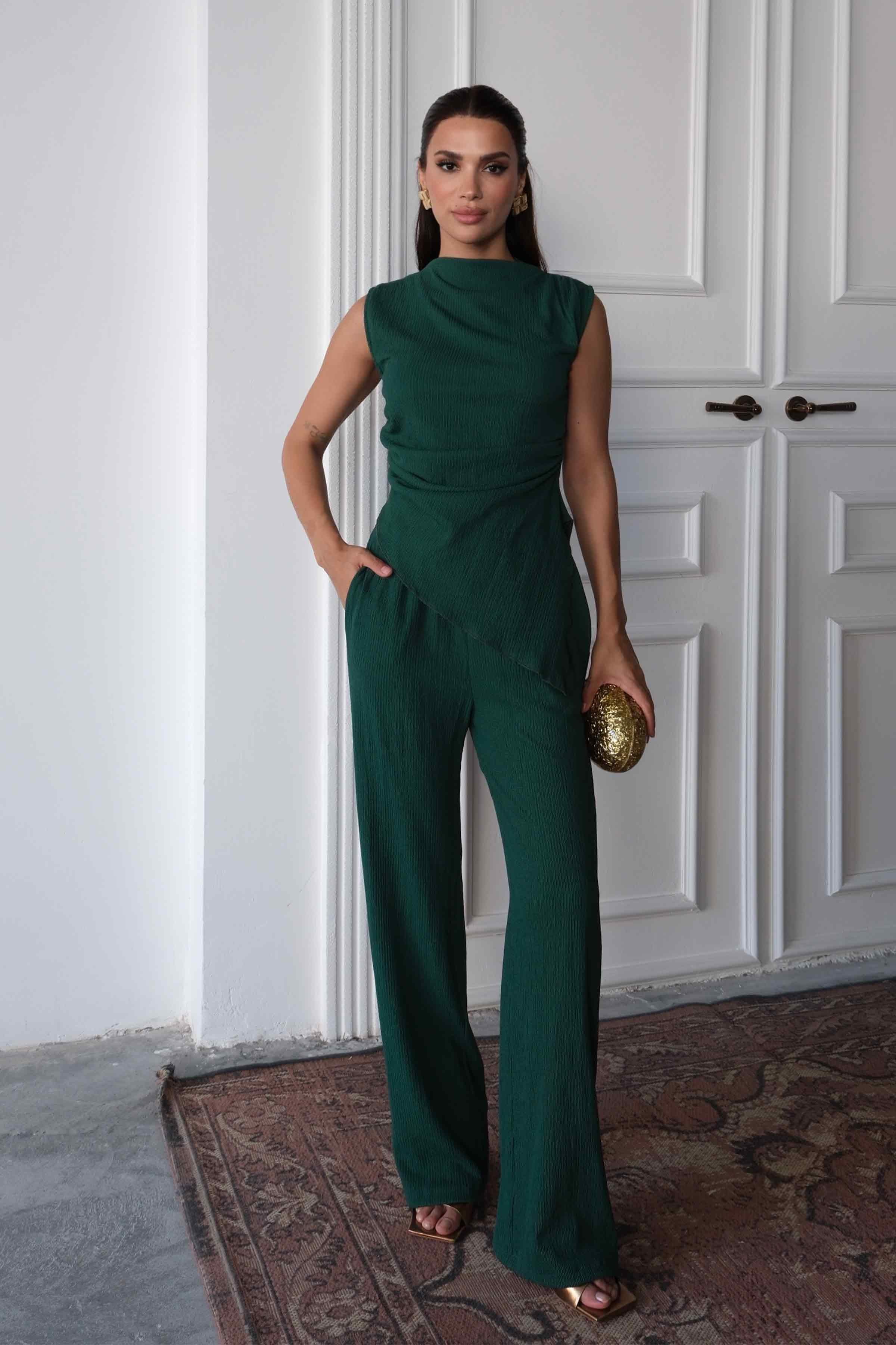 Women’s Regular Fit Crinkle Cotton Blouse & Pants Set – Green (Y-25-7762)