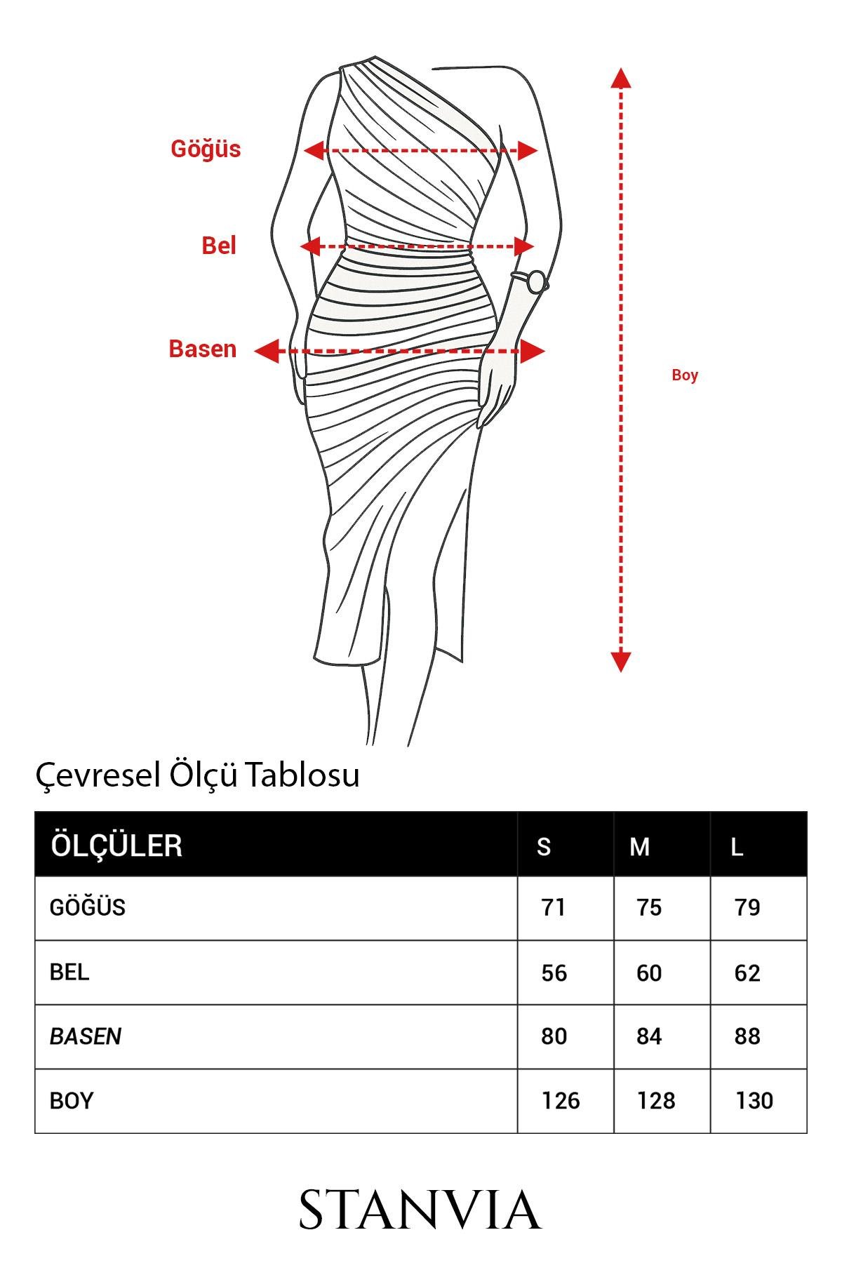 Şık tek omuz detayıyla öne çıkan bu model, hem zarafeti hem de modern trendleri bir arada sunar. Uzunluğuyla dengeli bir görünüm sağlayan bu midi elbise, ister özel davetlerde ister şık bir akşam yemeği için elbise arayanlara mükemmel bir alternatiftir.
