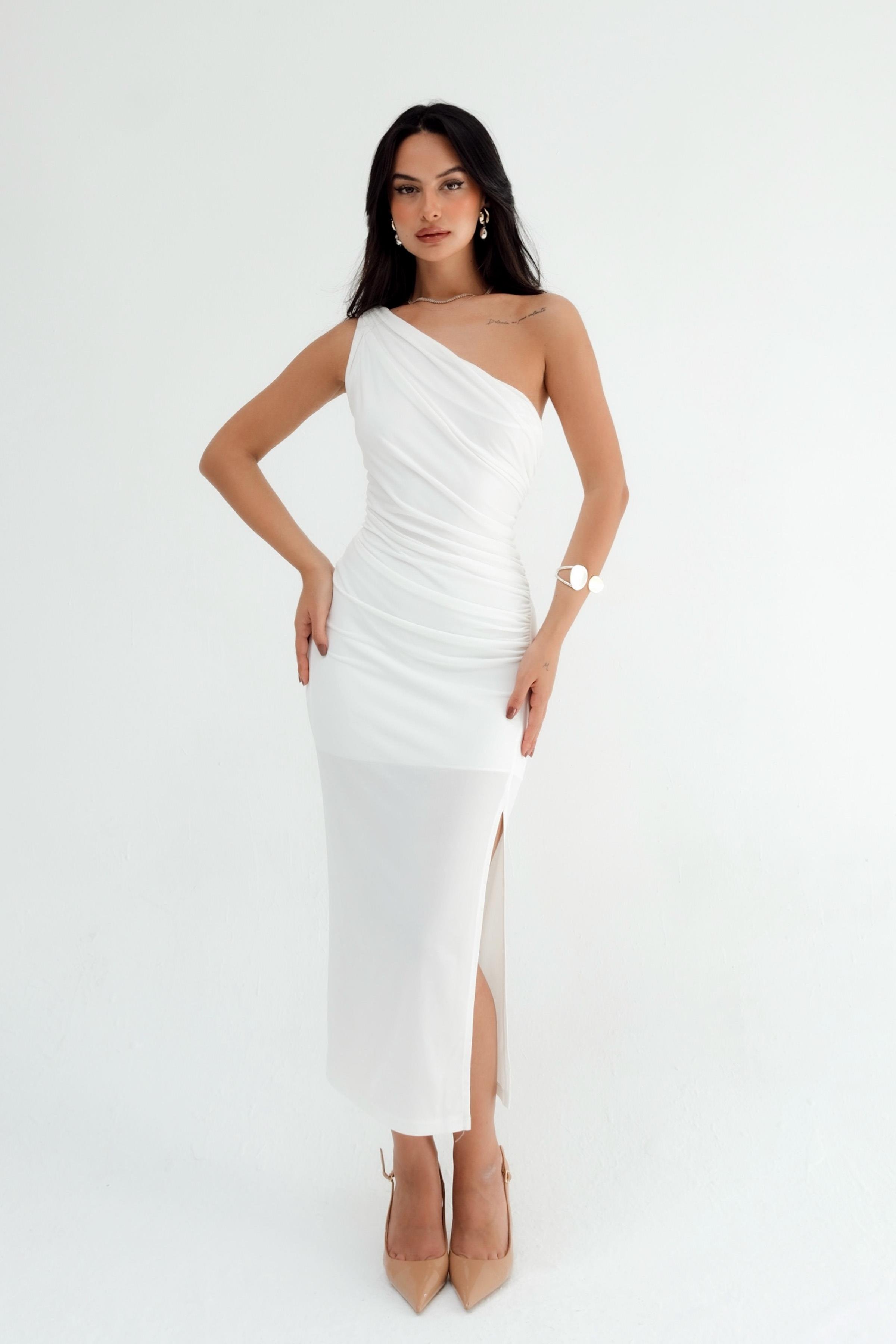 One-Shoulder Draped Sandy Midi/Maxi Dress - White