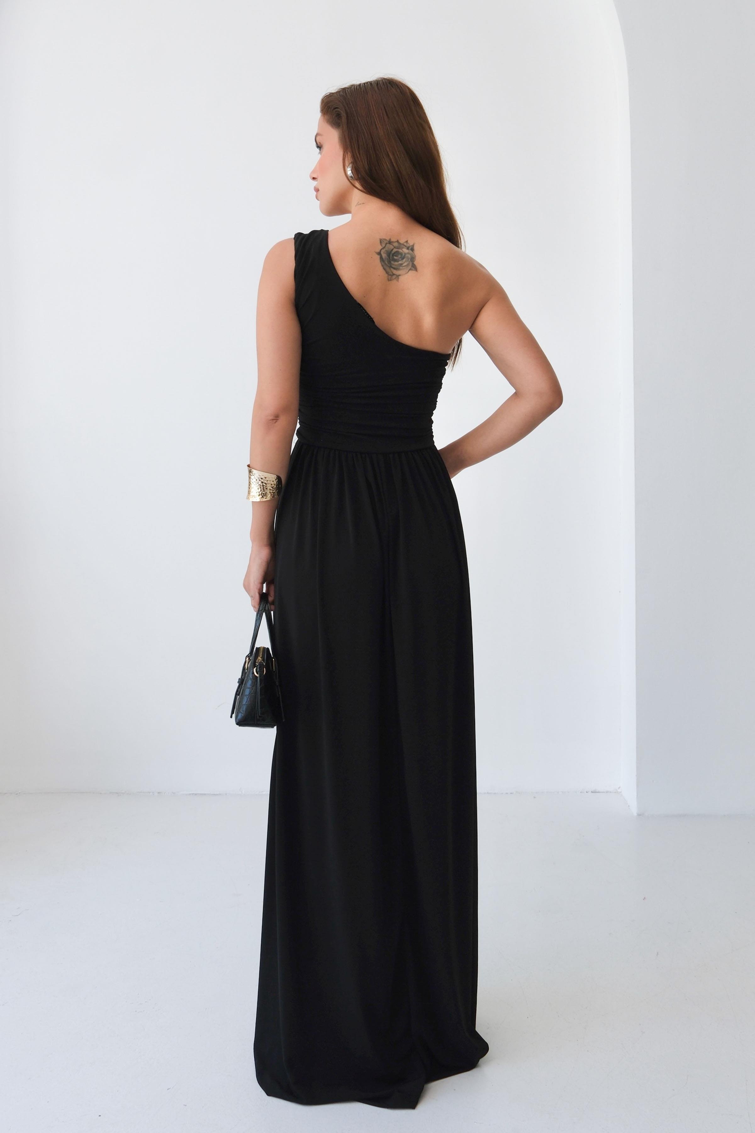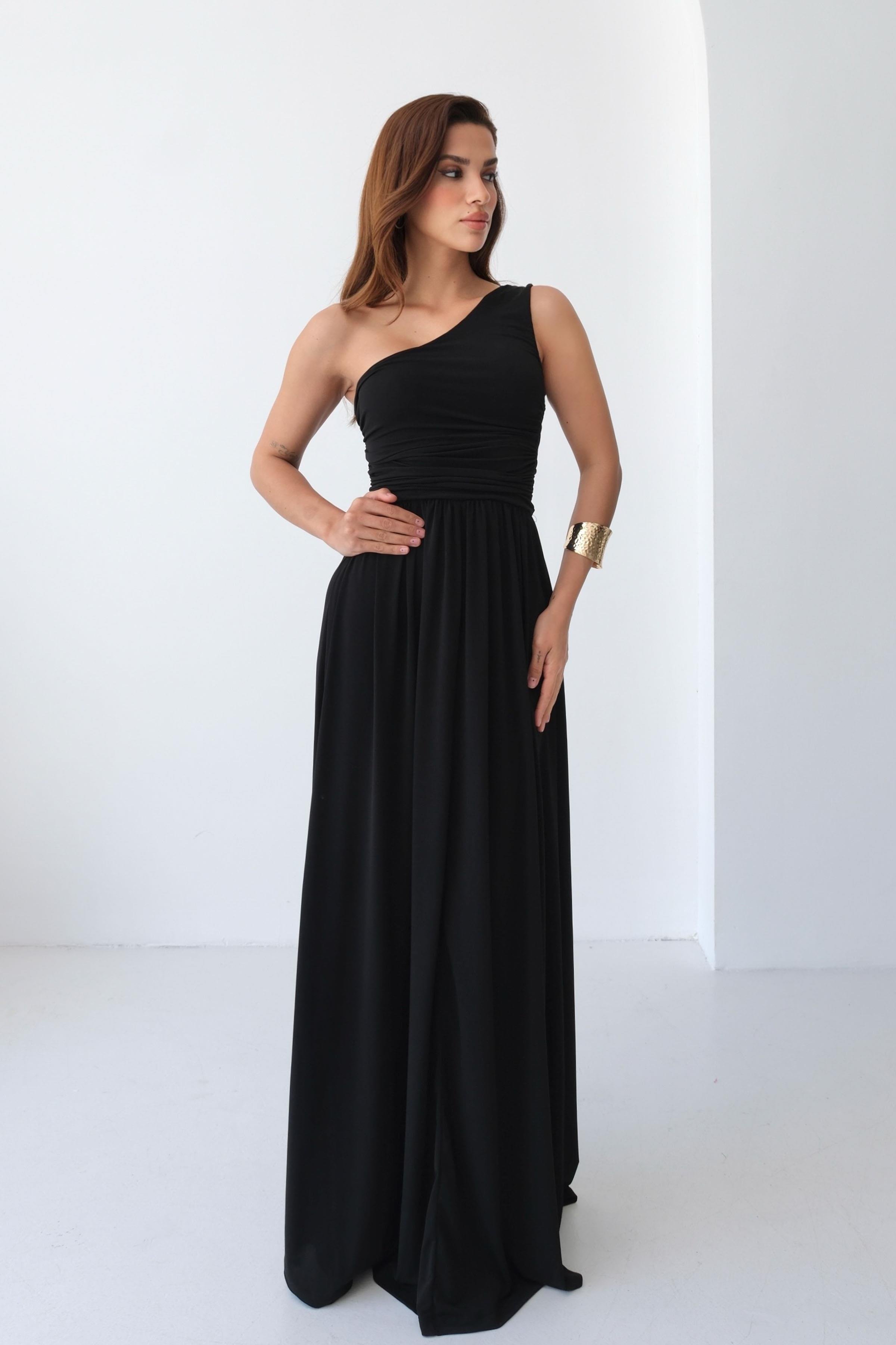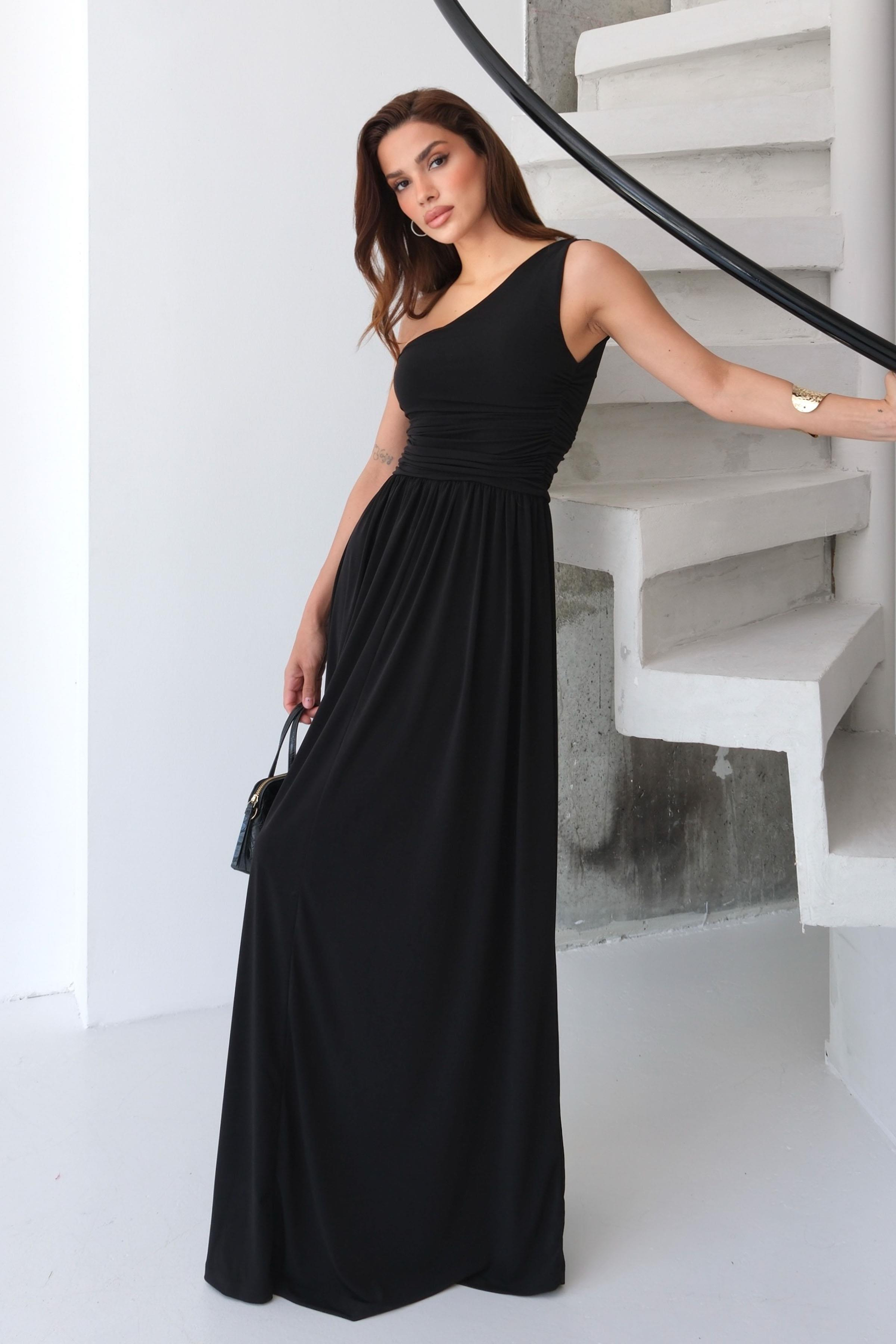 One-Shoulder Draped Sandy Maxi Dress – Black (Y-25-7763)