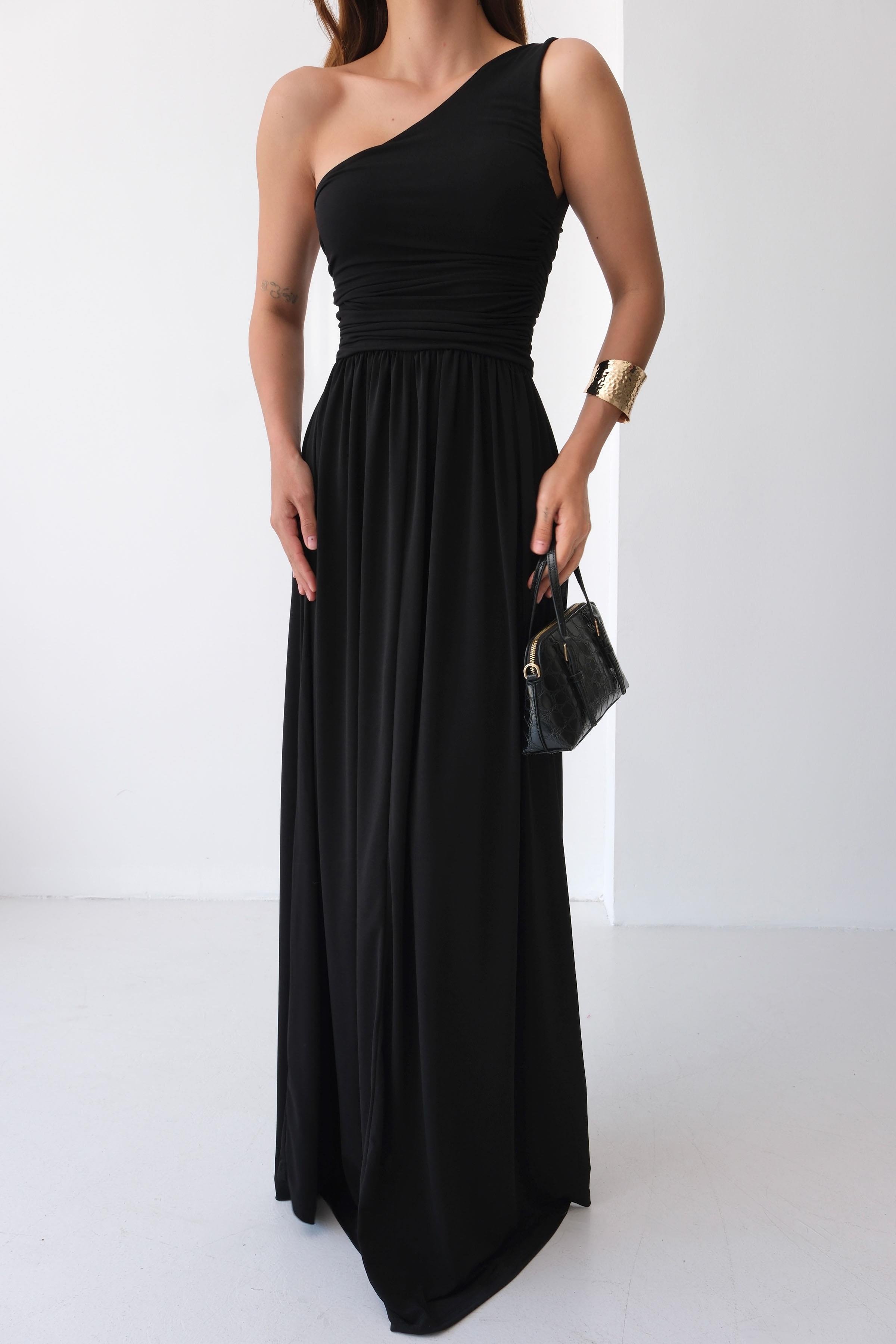 One-Shoulder Draped Sandy Maxi Dress – Black