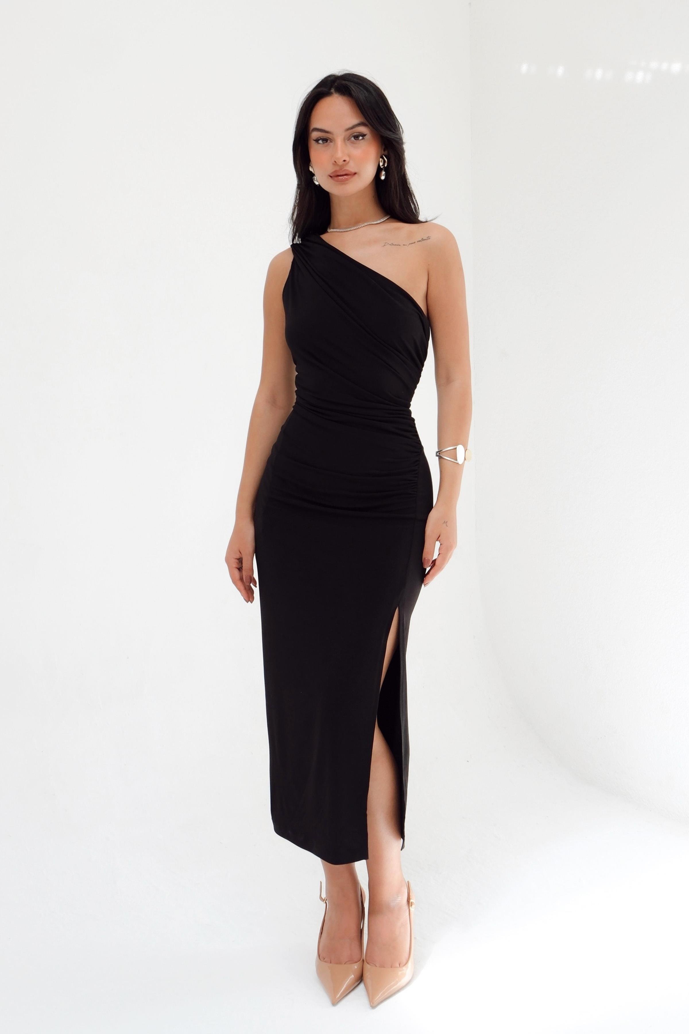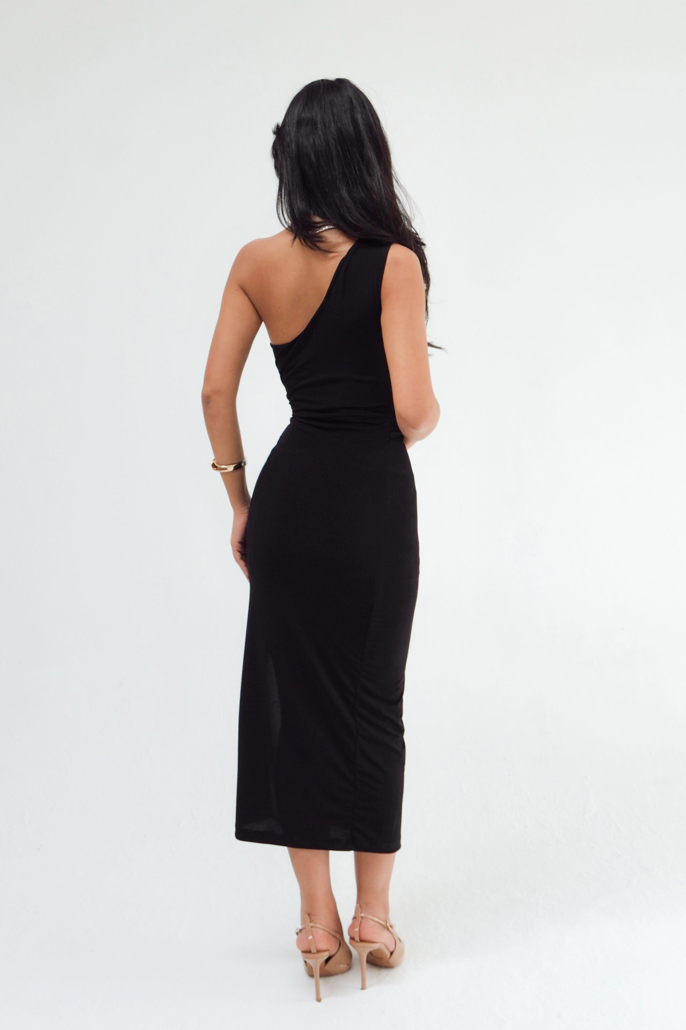 One-Shoulder Draped Sandy Midi/Maxi Dress - Black