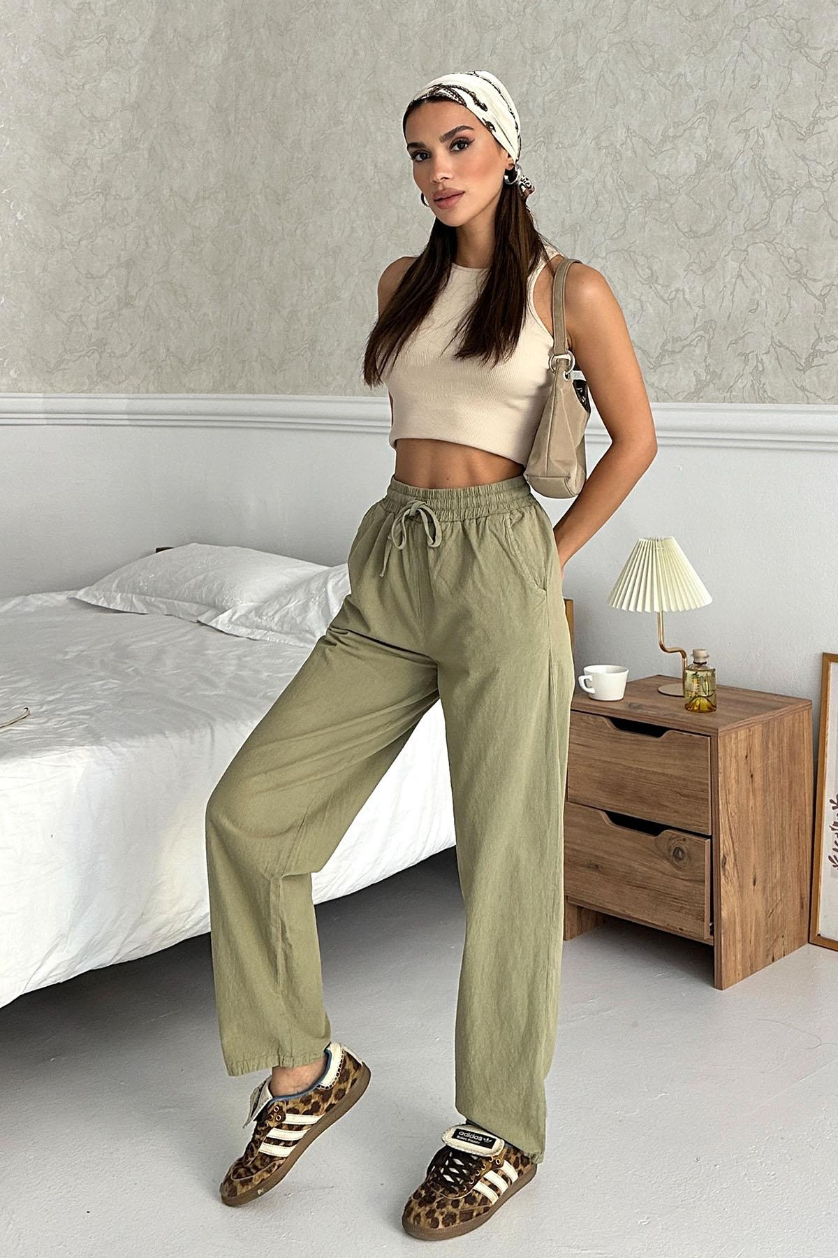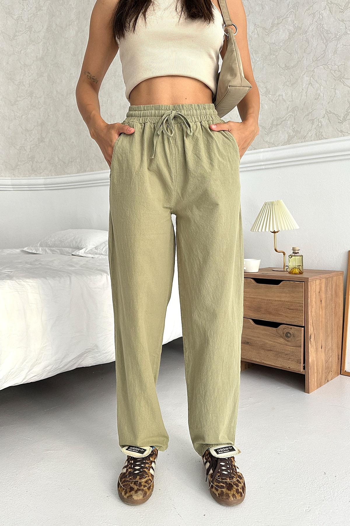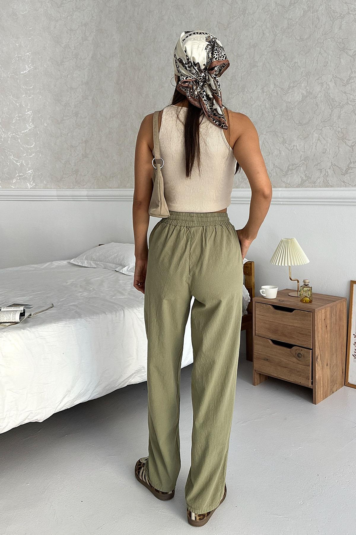 Women’s High-Waist Drawstring 100% Cotton Relax Fit Straight-Leg Pants – Light Green (Y-25-6701)