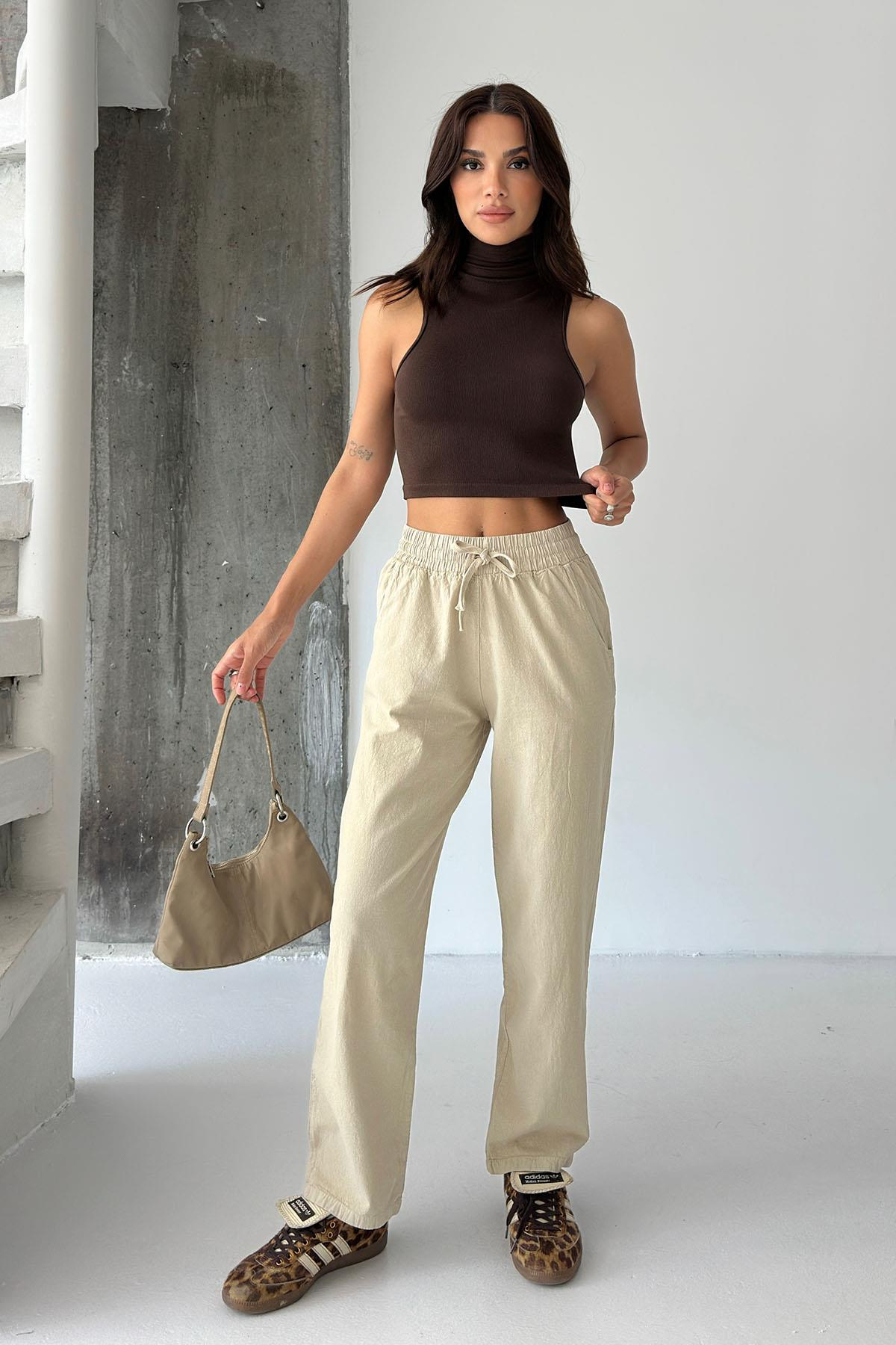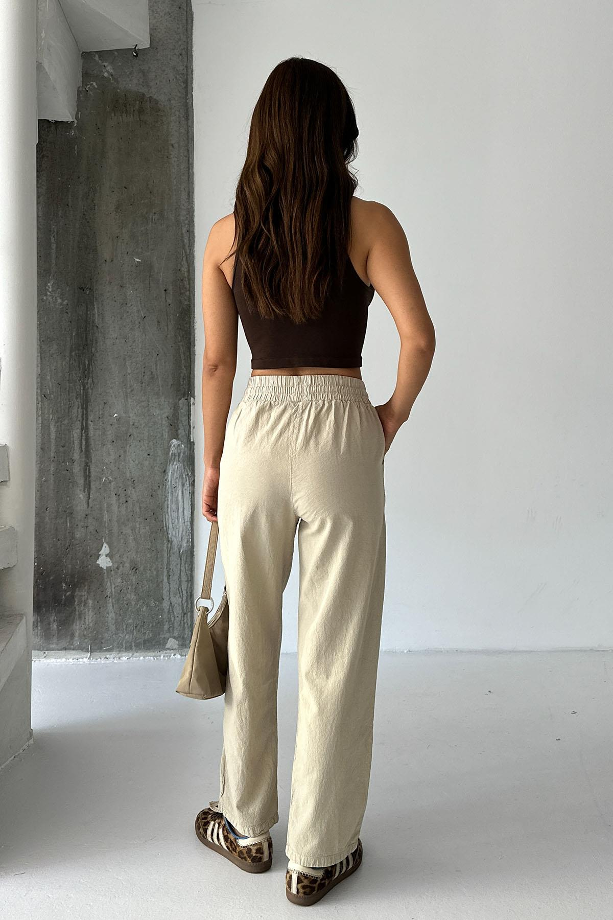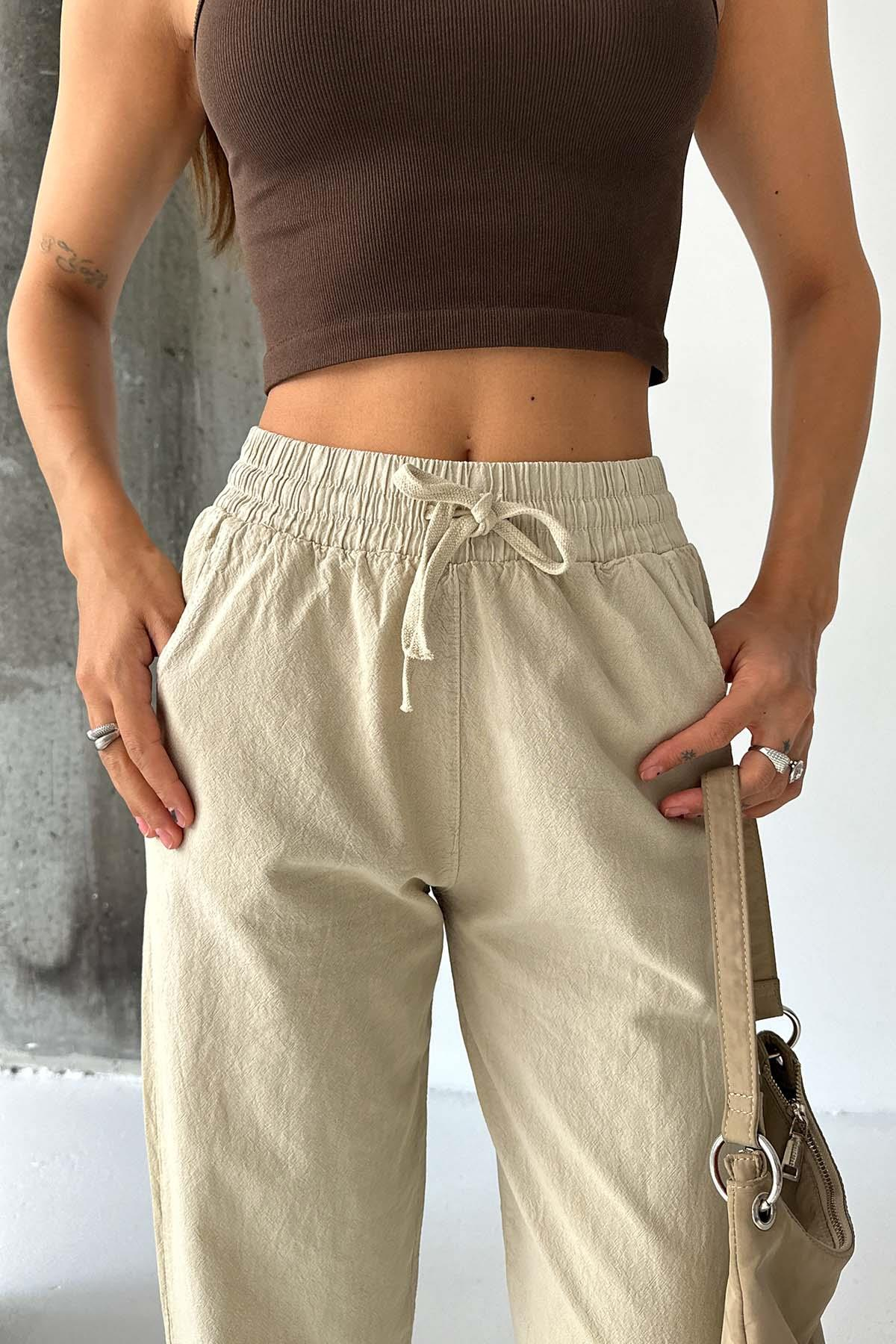 Women’s High-Waist Drawstring 100% Cotton Relax Fit Straight-Leg Pants – Beige (Y-25-6701)