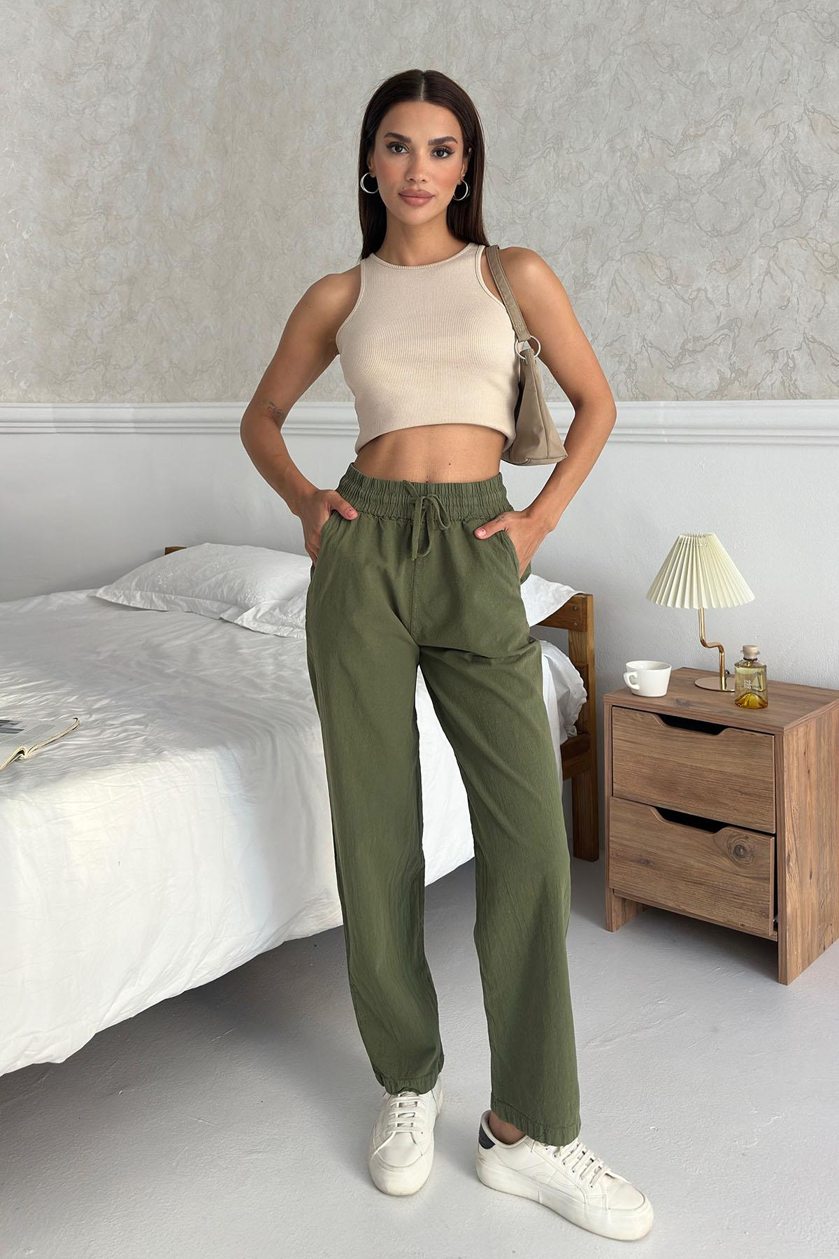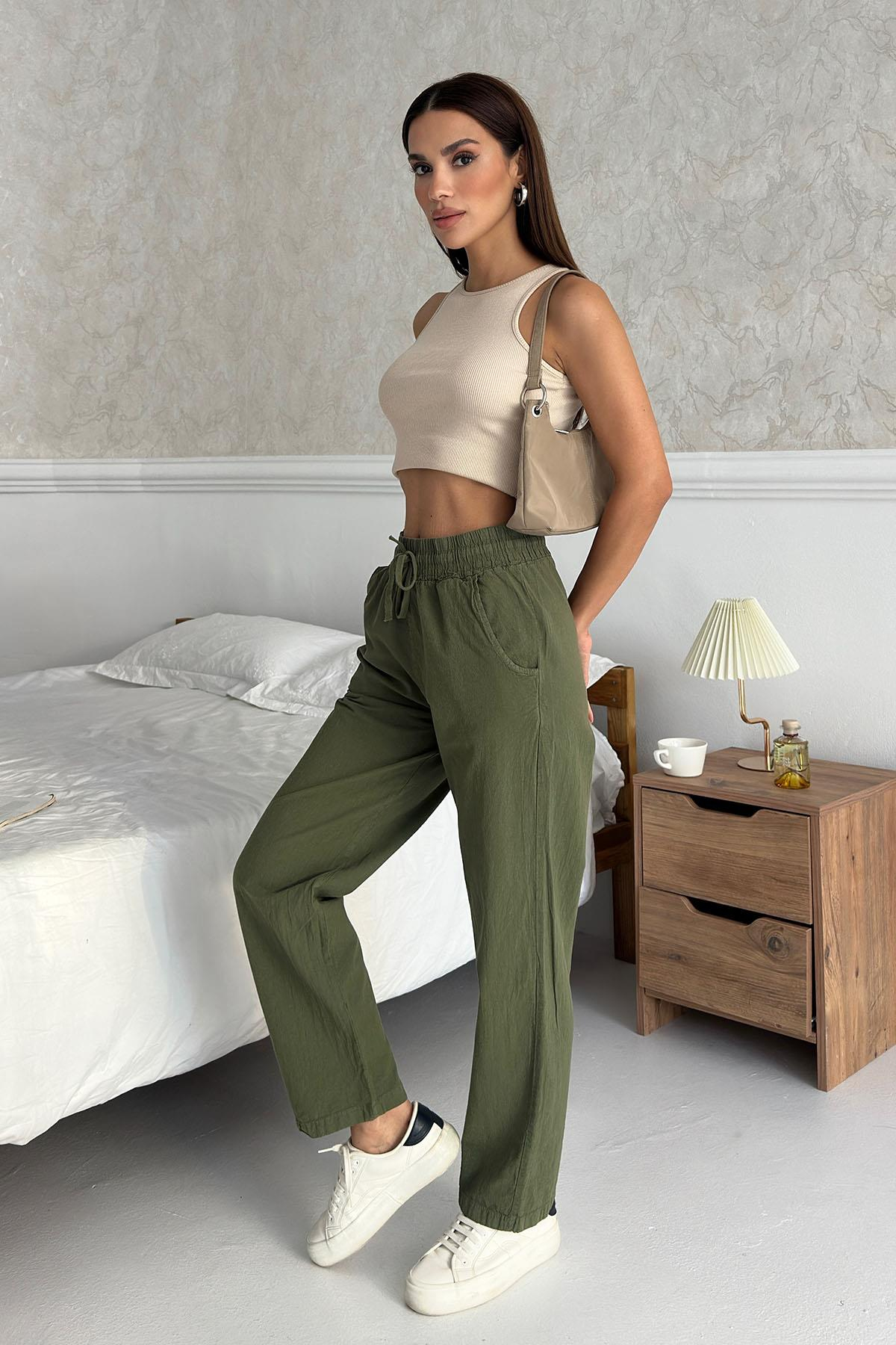 Women’s High-Waist Drawstring 100% Cotton Relax Fit Straight-Leg Pants – Khaki (Y-25-6701)