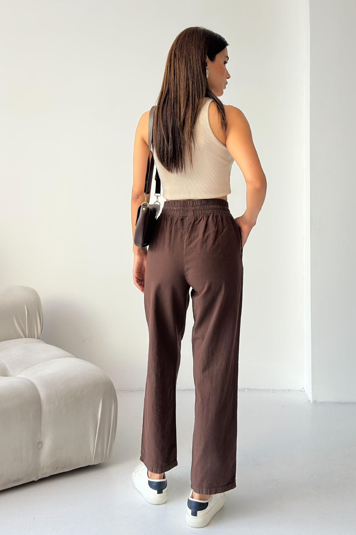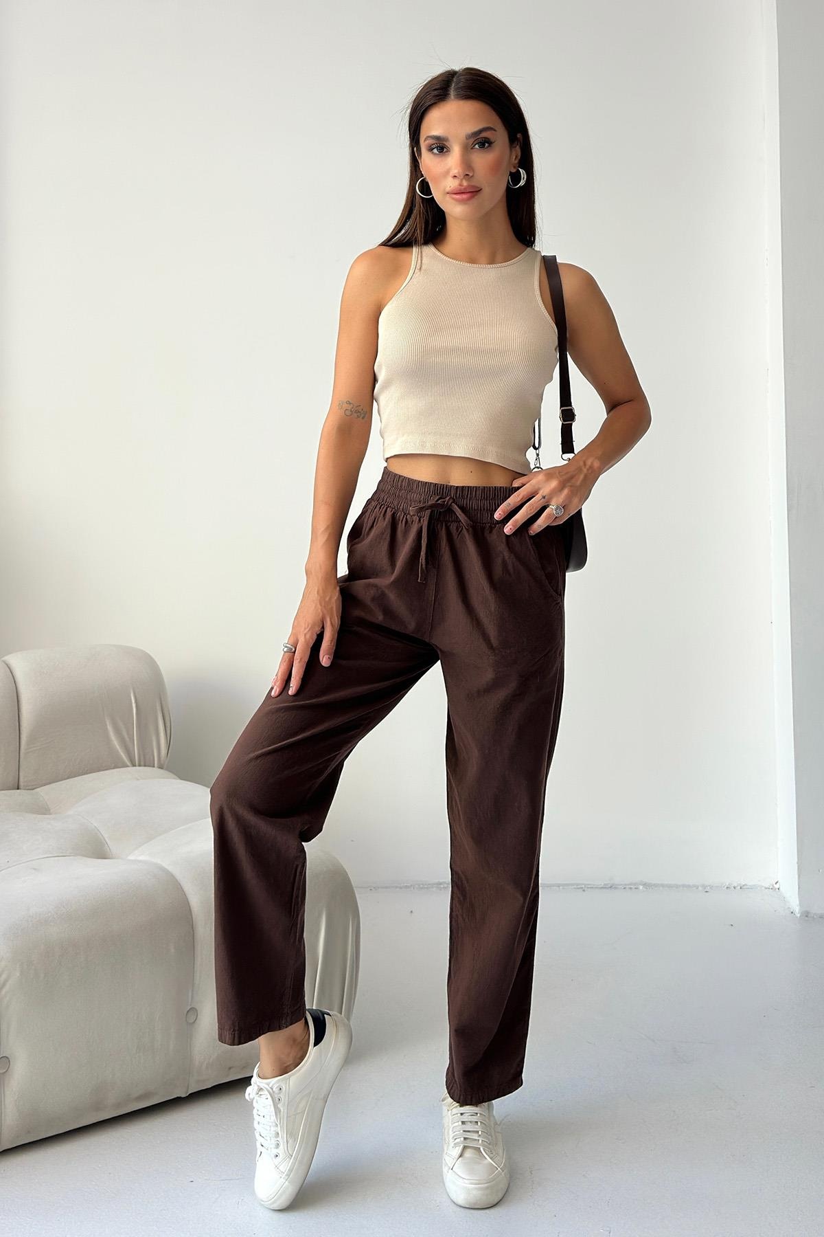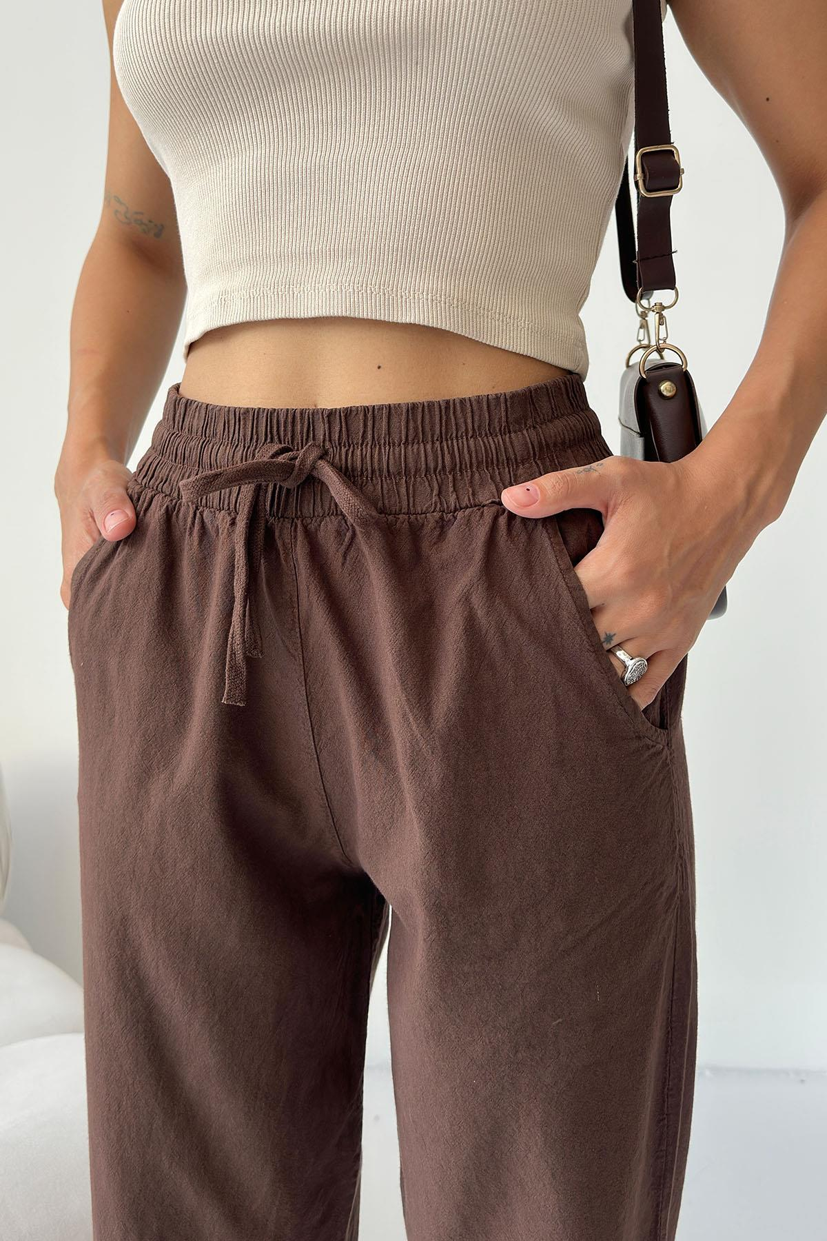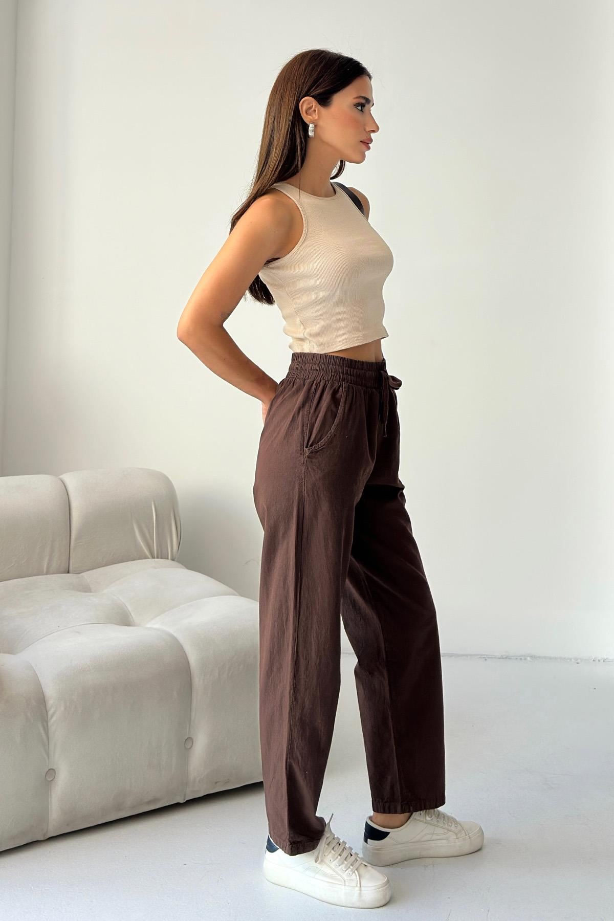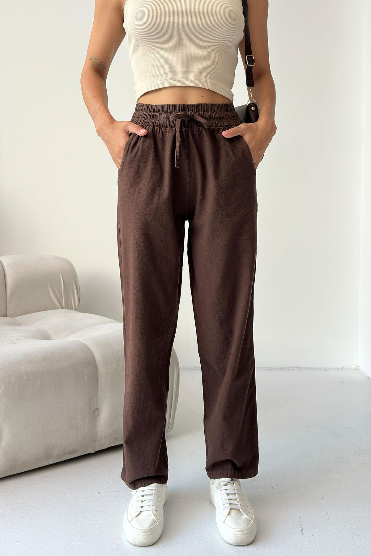 Women’s High-Waist Drawstring 100% Cotton Relax Fit Straight-Leg Pants – Brown (Y-25-6701)