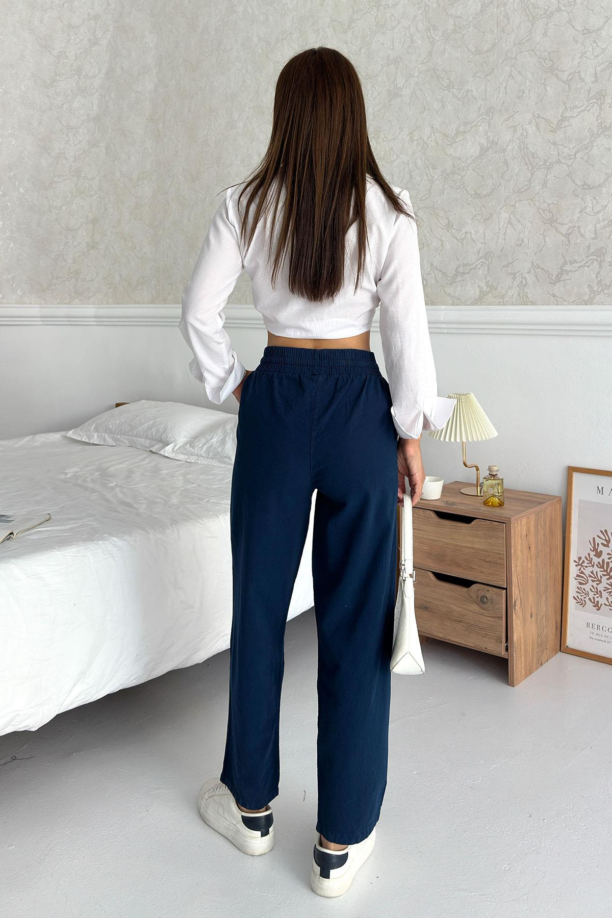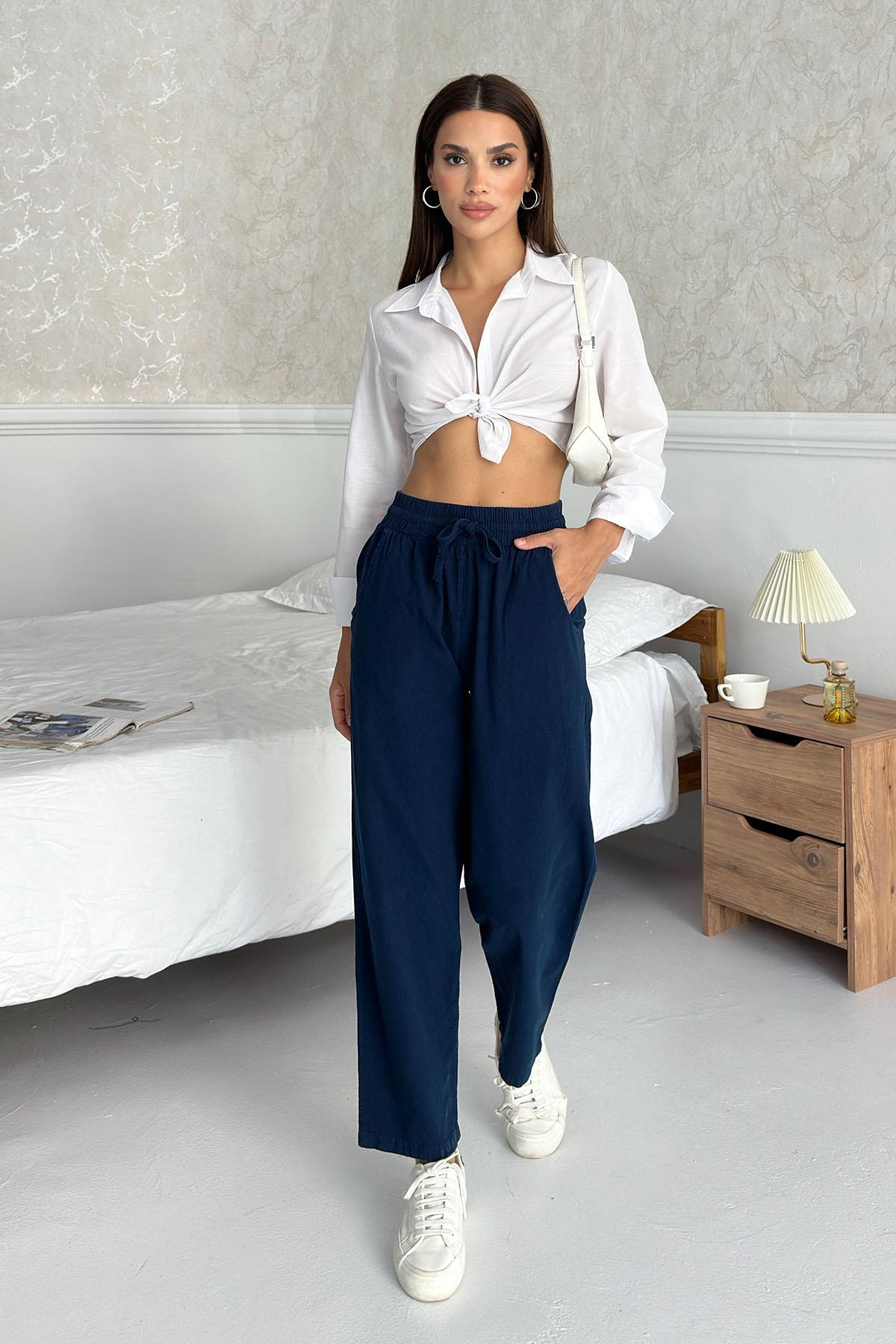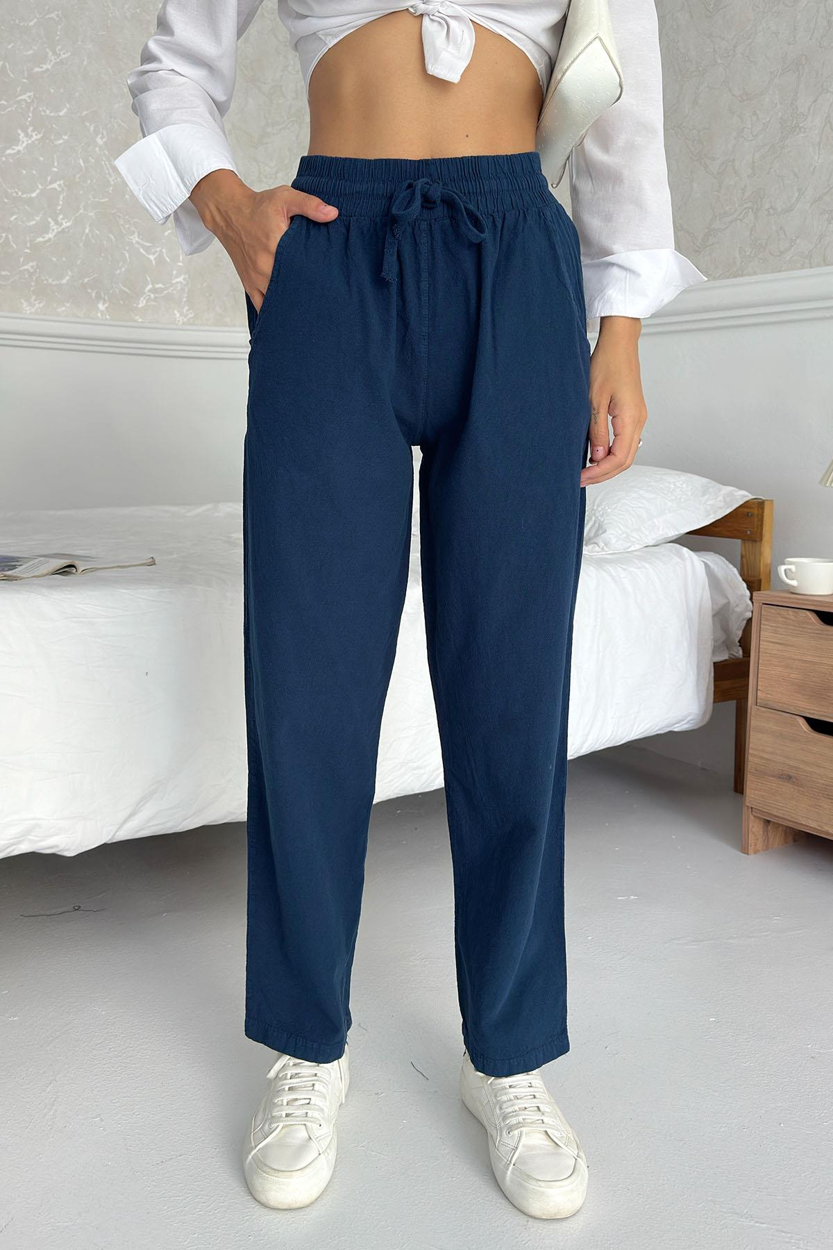 Women’s High-Waist Drawstring 100% Cotton Relax Fit Straight-Leg Pants – Navy (Y-25-6701)