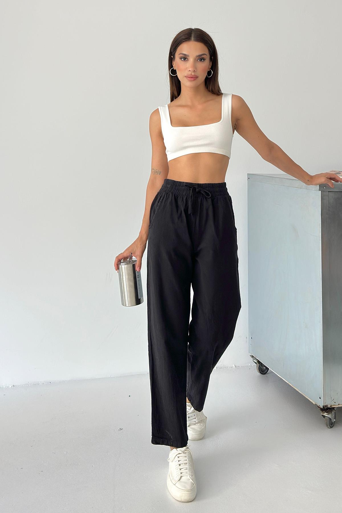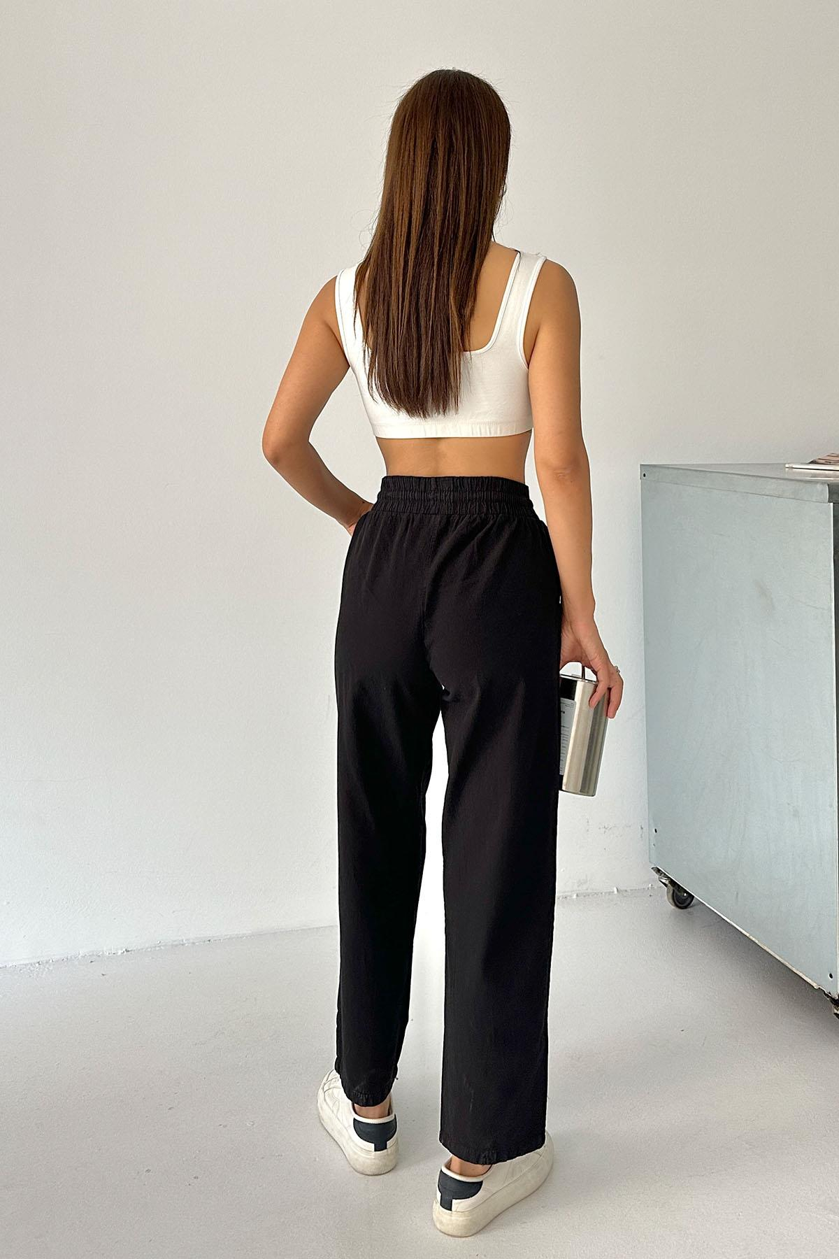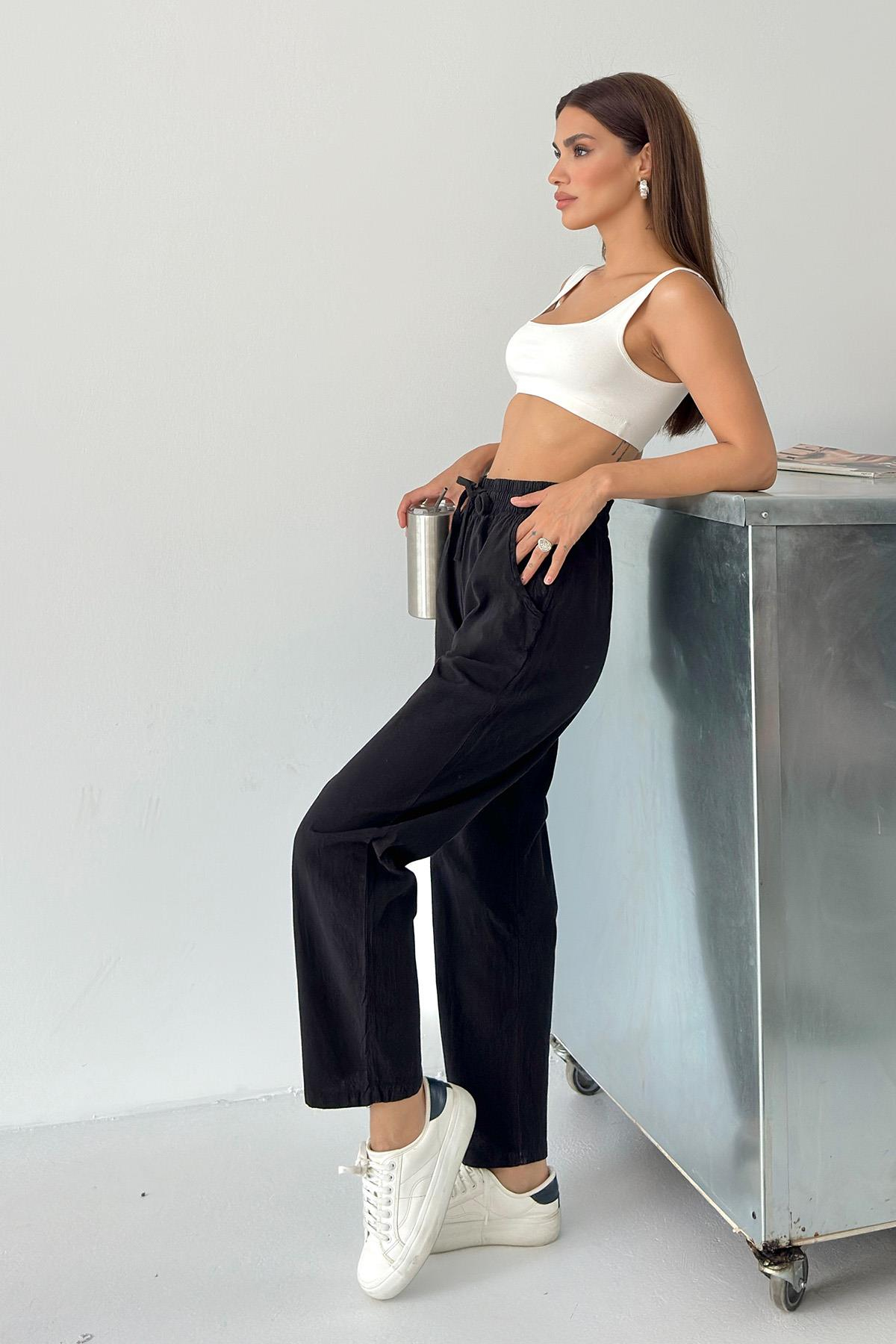 Women’s High-Waist Drawstring 100% Cotton Relax Fit Straight-Leg Pants – Black (Y-25-6701)